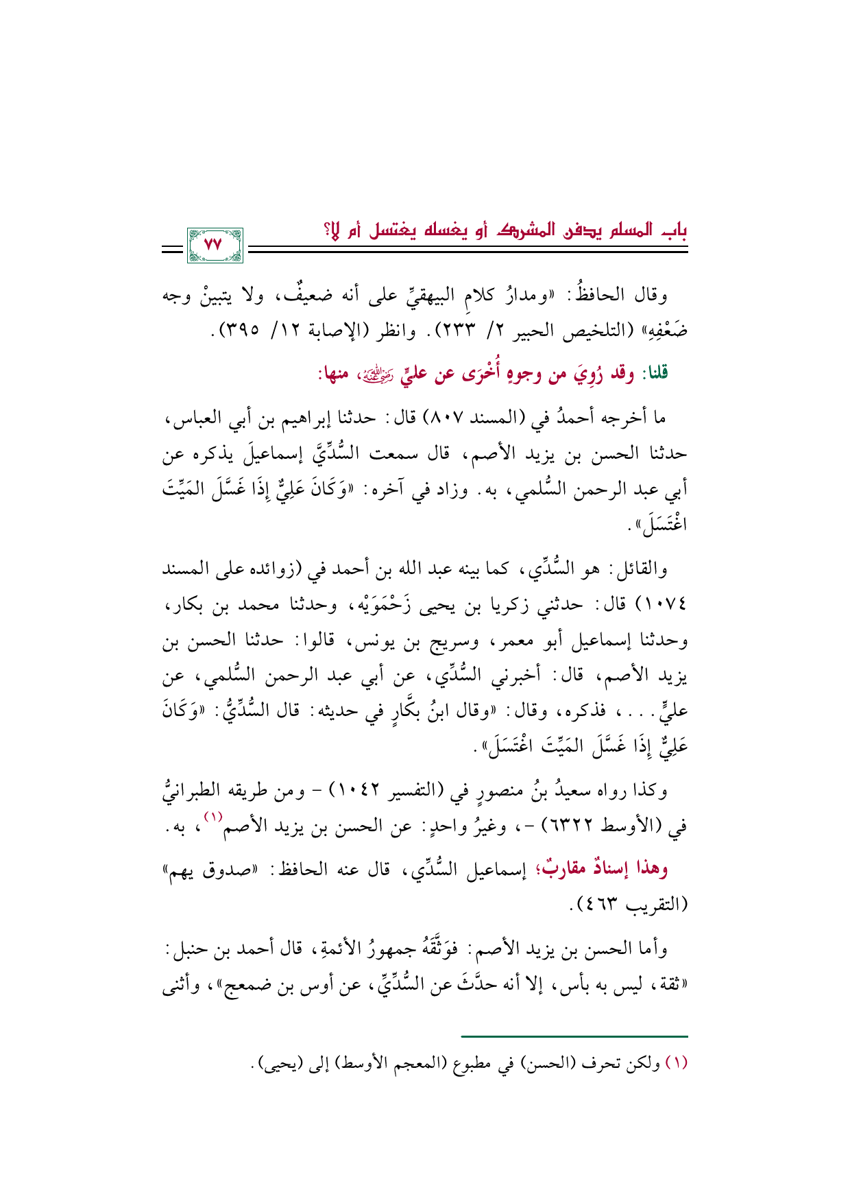ما أخرجه أحمدُ في (المسند ٨٠٧) قال: حدثنا إبراهيم بن أبي العباس، حدثنا الحسن بن يزيد الأصم، قال سمعت السُّدِّيَّ إسماعيلَ يذكره عن أبي عبد الرحمن السُّلمي، به. وزاد في آخره: ((وَكَانَ عَلِيٌّ إِذَا غَسَّلَ المَيِّتَ اغْتَسَلَ)).
