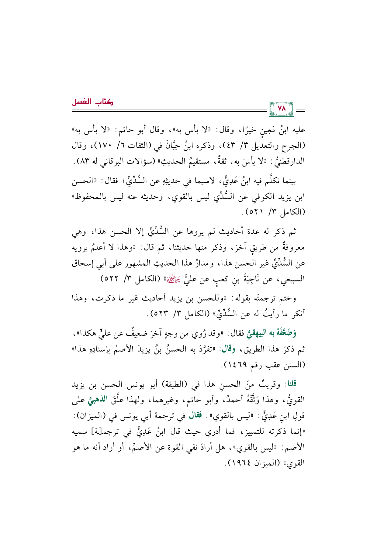 قلنا: وقريبٌ منَ الحسنِ هذا في (الطبقة) أبو يونس الحسن بن يزيد القويُّ، وهذا وَثَّقَهُ أحمدُ، وأبو حاتم، وغيرهما، ولهذا علَّقَ الذهبيُّ على قولِ ابنِ عَدِيٍّ: "ليس بالقوي". فقال في ترجمة أبي يونس في (الميزان): "إنما ذكرته للتمييز، فما أدري حيث قال ابنُ عَدِيٍّ في ترجمـ[ـة] سميه الأصم: "ليس بالقوي"، هل أرادَ نفي القوة عن الأصمِّ، أو أراد أنه ما هو القوي" (الميزان ١٩٦٤).