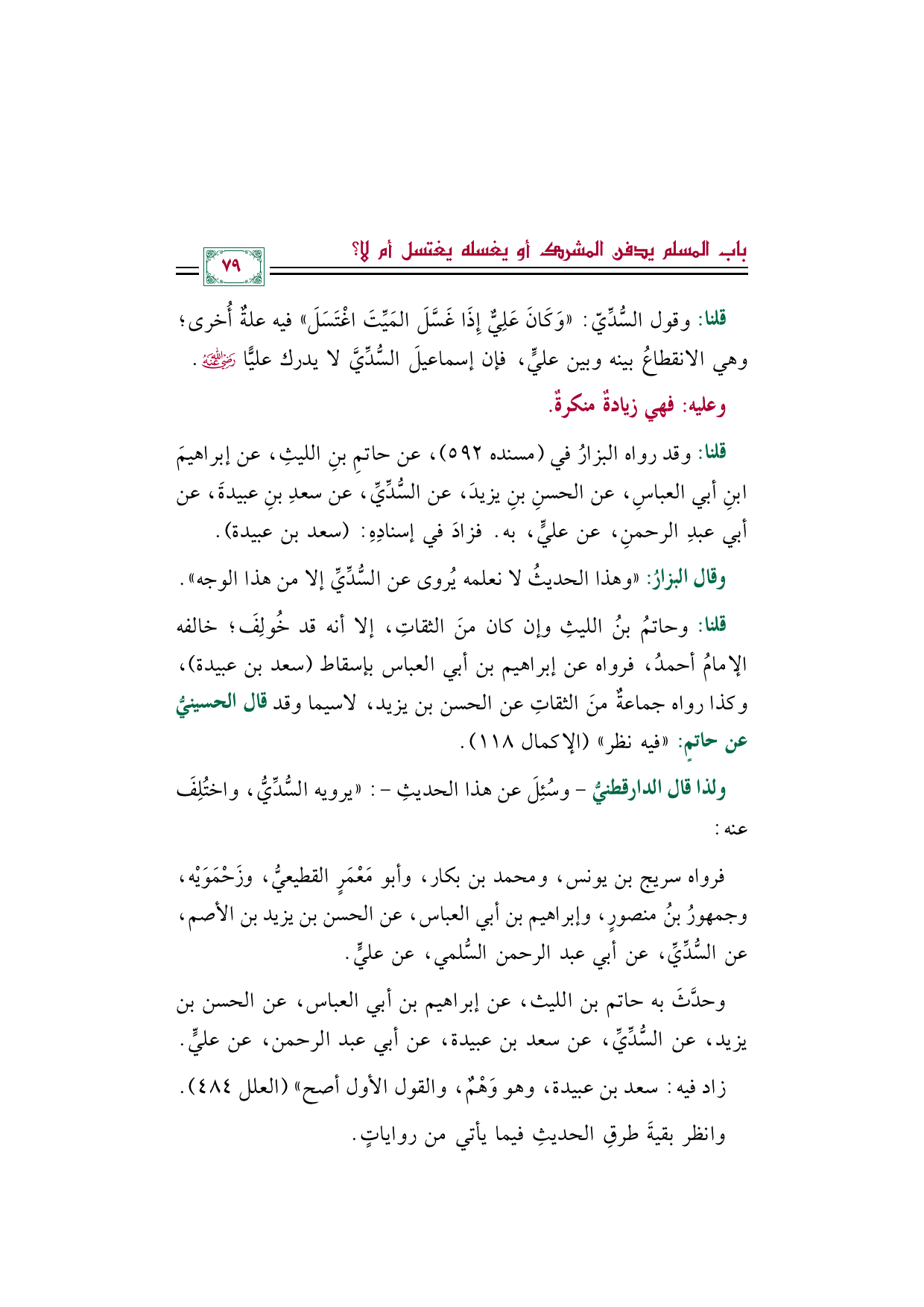 قلنا: وقول السُّدِّيّ: ((وَكَانَ عَلِيٌّ إِذَا غَسَّلَ المَيِّتَ اغْتَسَلَ)) فيه علةٌ أُخرى؛ وهي الانقطاعُ بينه وبين عليٍّ، فإن إسماعيلَ السُّدِّيَّ لا يدرك عليًّا رضي الله عنه.