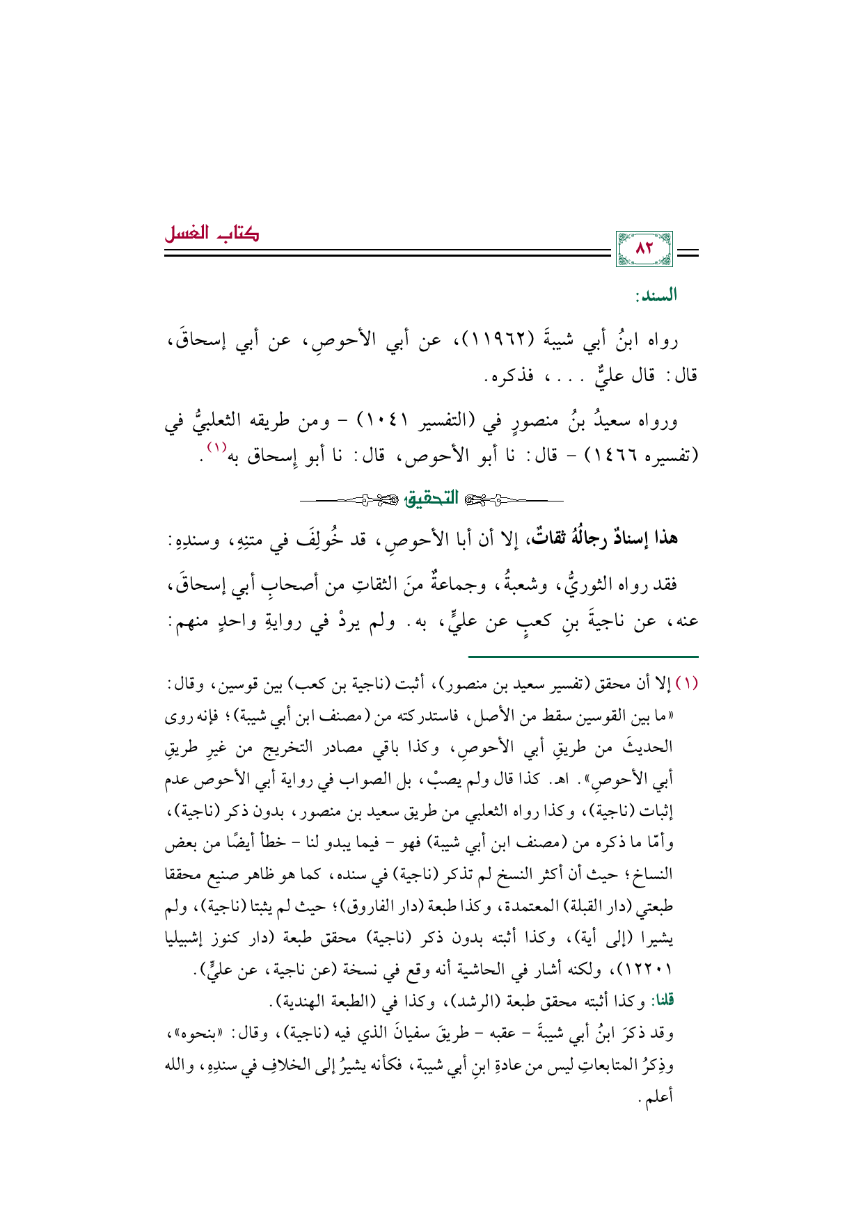 (¬١) إلا أن محقق (تفسير سعيد بن منصور)، أثبت (ناجية بن كعب) بين قوسين، وقال: "ما بين القوسين سقط من الأصل، فاستدركته من (مصنف ابن أبي شيبة)؛ فإنه روى الحديثَ من طريقِ أبي الأحوصِ، وكذا باقي مصادر التخريج من غيرِ طريقِ أبي الأحوصِ" اهـ. كذا قال ولم يصبْ، بل الصواب في رواية أبي الأحوص عدم إثبات (ناجية)، وكذا رواه الثعلبي من طريق سعيد بن منصور، بدون ذكر (ناجية)، وأمّا ما ذكره من (مصنف ابن أبي شيبة) فهو -فيما يبدو لنا- خطأ أيضًا من بعض النساخ؛ حيث أن أكثر النسخ لم تذكر (ناجية) في سنده، كما هو ظاهر صنيع محققا طبعتي (دار القبلة) المعتمدة، وكذا طبعة (دار الفاروق)؛ حيث لم يثبتا (ناجية)، ولم يشيرا (إلى أية)، وكذا أثبته بدون ذكر (ناجية) محقق طبعة (دار كنوز إشبيليا ١٢٢٠١)، ولكنه أشار في الحاشية أنه وقع في نسخة (عن ناجية، عن عليٍّ)، قلنا: وكذا أثبته محقق طبعة (الرشد)، وكذا في (الطبعة الهندية).