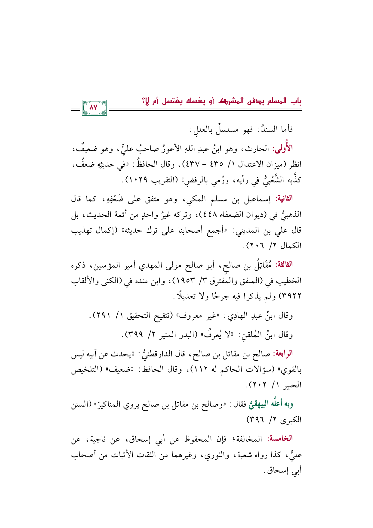 الرابعة: صالح بن مقاتل بن صالح، قال الدارقطنيُّ: "يحدث عن أبيه ليس بالقوي" (سؤالات الحاكم له ١١٢)، وقال الحافظ: "ضعيف" (التلخيص الحبير ١/ ٢٠٢).
