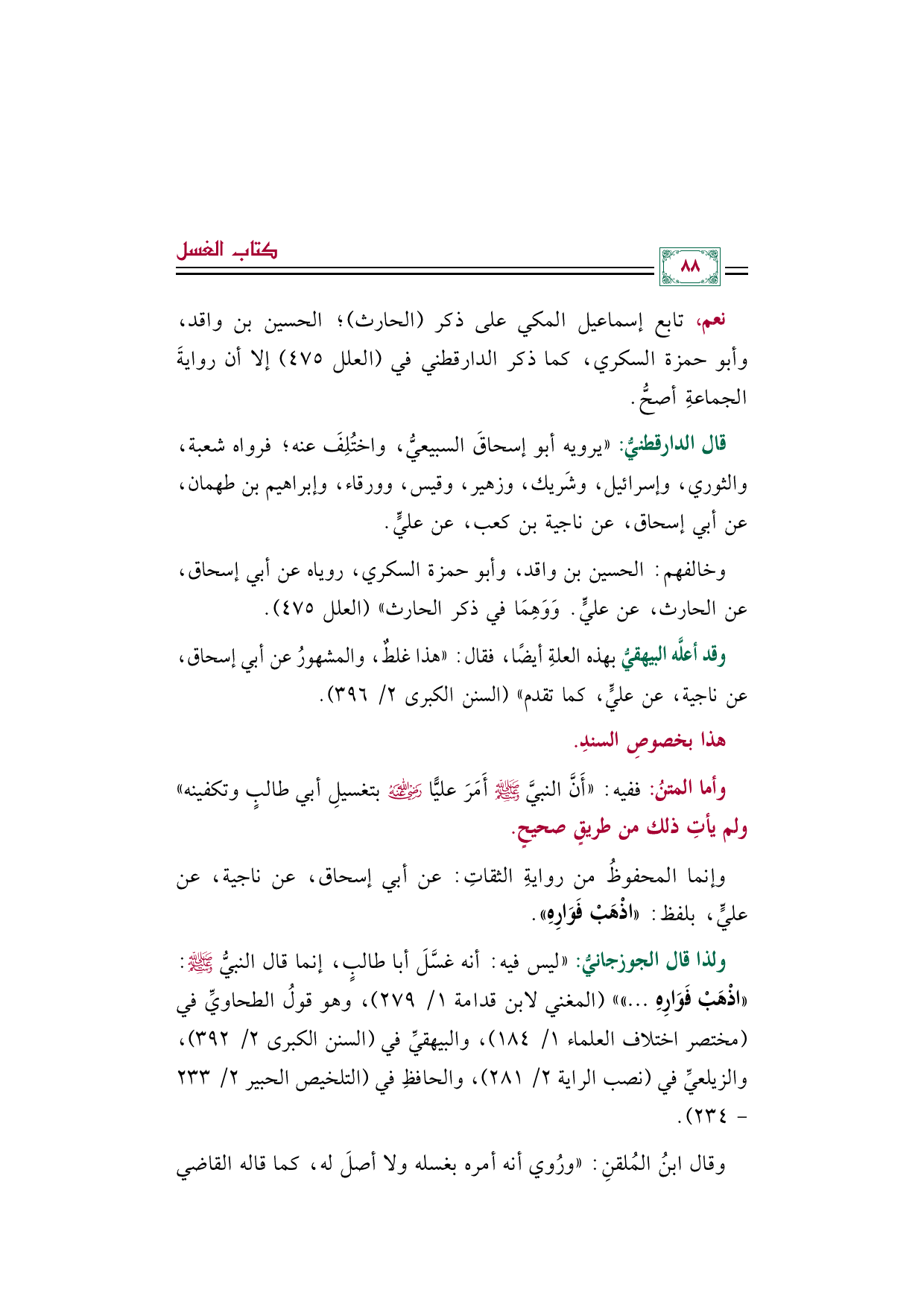 ولذا قال الجوزجانيُّ: "ليس فيه: أنه غسَّلَ أبا طالبٍ، إنما قال النبيُّ صلى الله عليه وسلم: ((اذْهَبْ فَوَارِهِ ... )) " (المغني لابن قدامة ١/ ٢٧٩)، وهو قولُ الطحاويِّ في (مختصر اختلاف العلماء ١/ ١٨٤)، والبيهقيِّ في (السنن الكبرى ٢/ ٣٩٢)، والزيلعيِّ في (نصب الراية ٢/ ٢٨١)، والحافظِ في (التلخيص الحبير ٢/ ٢٣٣ - ٢٣٤).