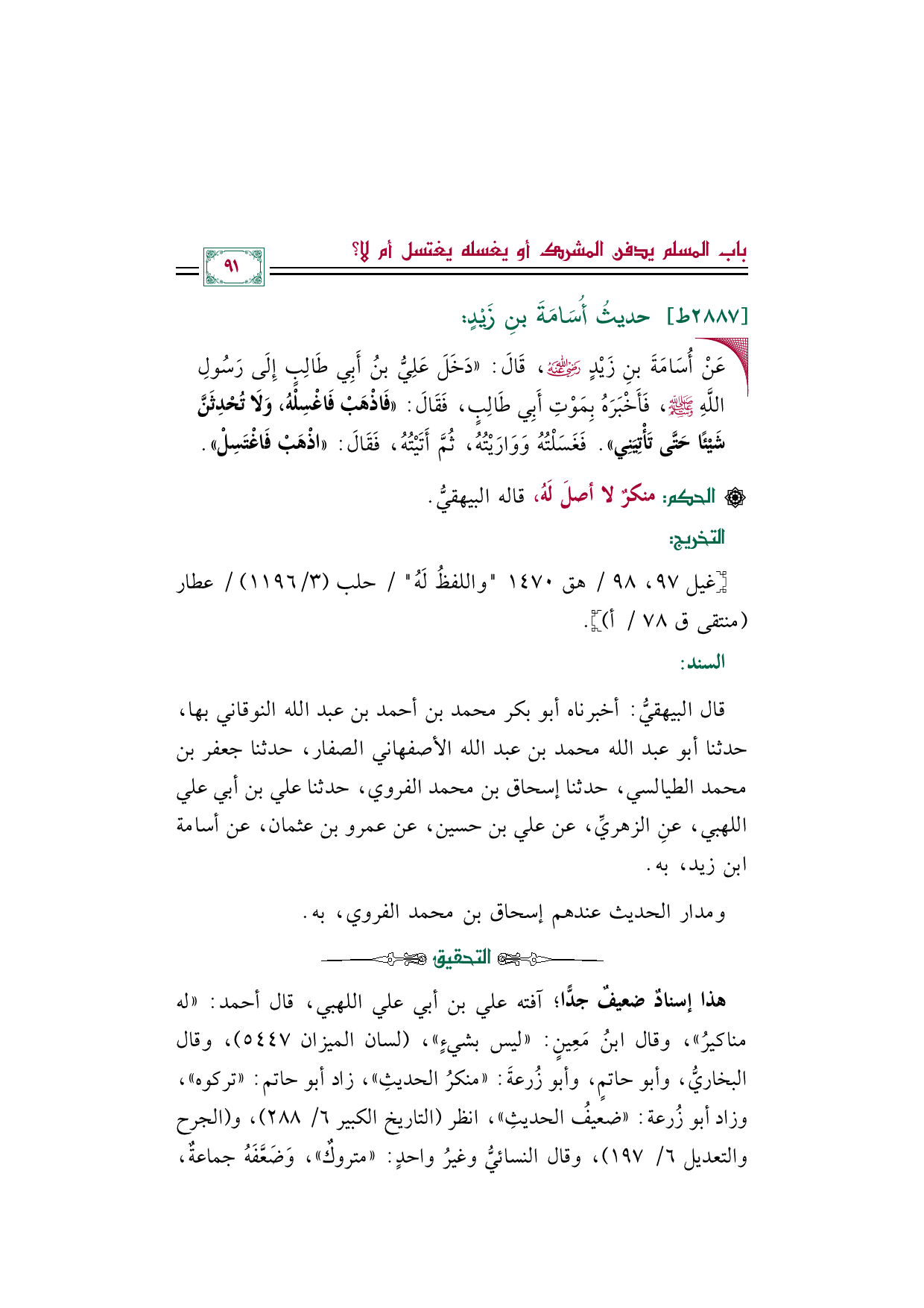 قال البيهقيُّ: أخبرناه أبو بكر محمد بن أحمد بن عبد الله النوقاني بها، حدثنا أبو عبد الله محمد بن عبد الله الأصفهاني الصفار، حدثنا جعفر بن محمد الطيالسي، حدثنا إسحاق بن محمد الفروي، حدثنا علي بن أبي علي اللهبي، عنِ الزهريِّ، عن علي بن حسين، عن عمرو بن عثمان، عن أسامة بن زيد، به.