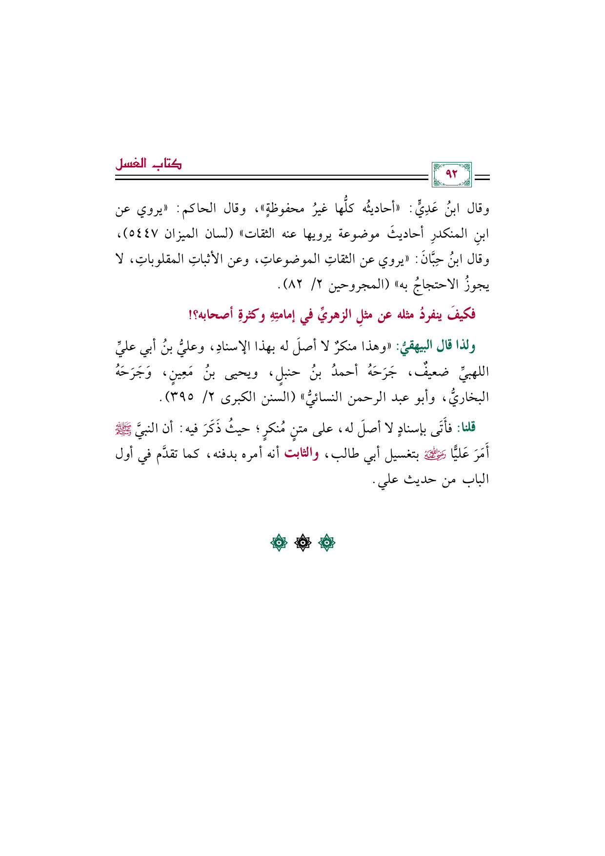 قلنا: فأَتَى بإسنادٍ لا أصلَ له، على متنٍ مُنكرٍ؛ حيثُ ذَكَرَ فيه: أن النبيَّ صلى الله عليه وسلم أَمَرَ عَليًّا رضي الله عنه بتغسيل أبي طالب، والثابت أنه أمره بدفنه، كما تقدَّم في أول الباب من حديث علي.