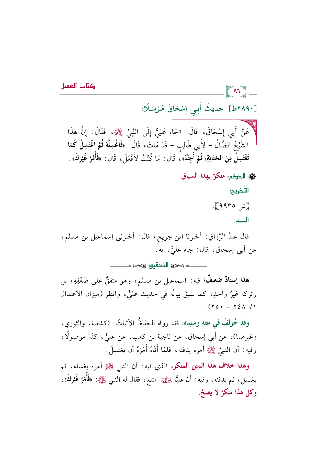 قال عبدُ الرَّزاقِ: أخبرنا ابن جريج، قال: أخبرني إسماعيل بن مسلم، عن أبي إسحاق، قال: جاء عليٌّ، به.