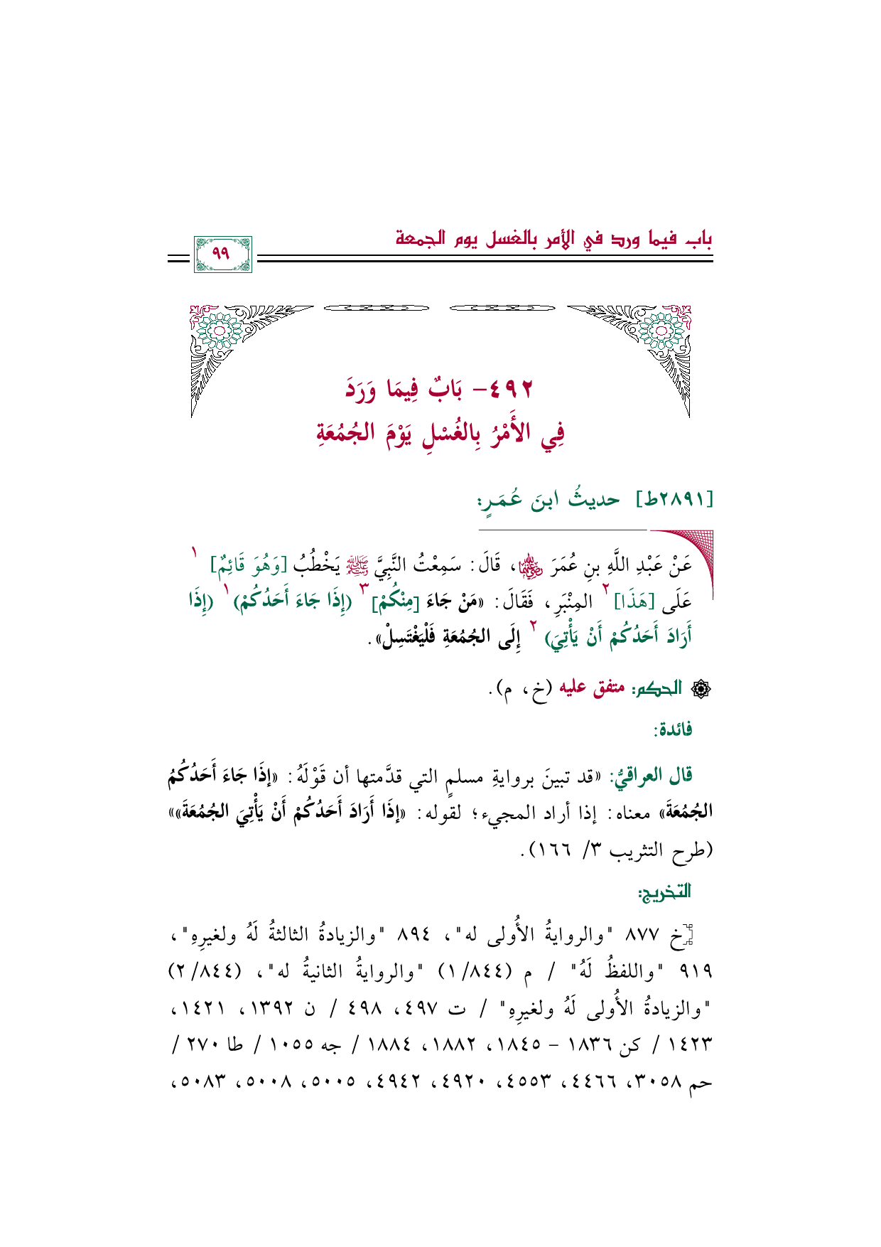 ◼ عَنْ عَبْدِ اللَّهِ بنِ عُمَرَ رضي الله عنهما، قَالَ: سَمِعْتُ النَّبِيَّ صلى الله عليه وسلم يَخْطُبُ [وَهُوَ قَائِمٌ] ١ عَلَى [هَذَا] ٢ المِنْبَرِ، فَقَالَ: ((مَنْ جَاءَ [مِنْكُمْ] ٣ (إِذَا جَاءَ أَحَدُكُمْ) ١ (إِذَا أَرَادَ أَحَدُكُمْ أَنْ يَأْتِيَ) ٢ إِلَى الجُمُعَةِ فَلْيَغْتَسِلْ)).