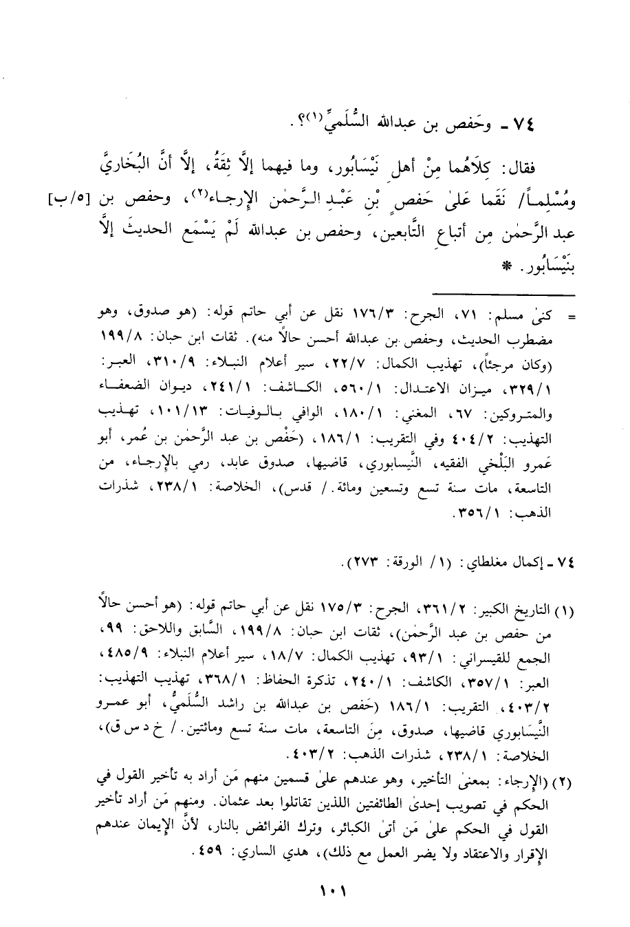 فقال كلاهما من اهل نيسابور وما فيهما الا ثقة الا ان البخاري ومسلما نقما على حفص بن عبد الرحمن الإرجاء وحفص بن عبد الرحمن من اتباع التابعين وحفص بن عبد الله لم يسمع الحديث الا بنيسابور