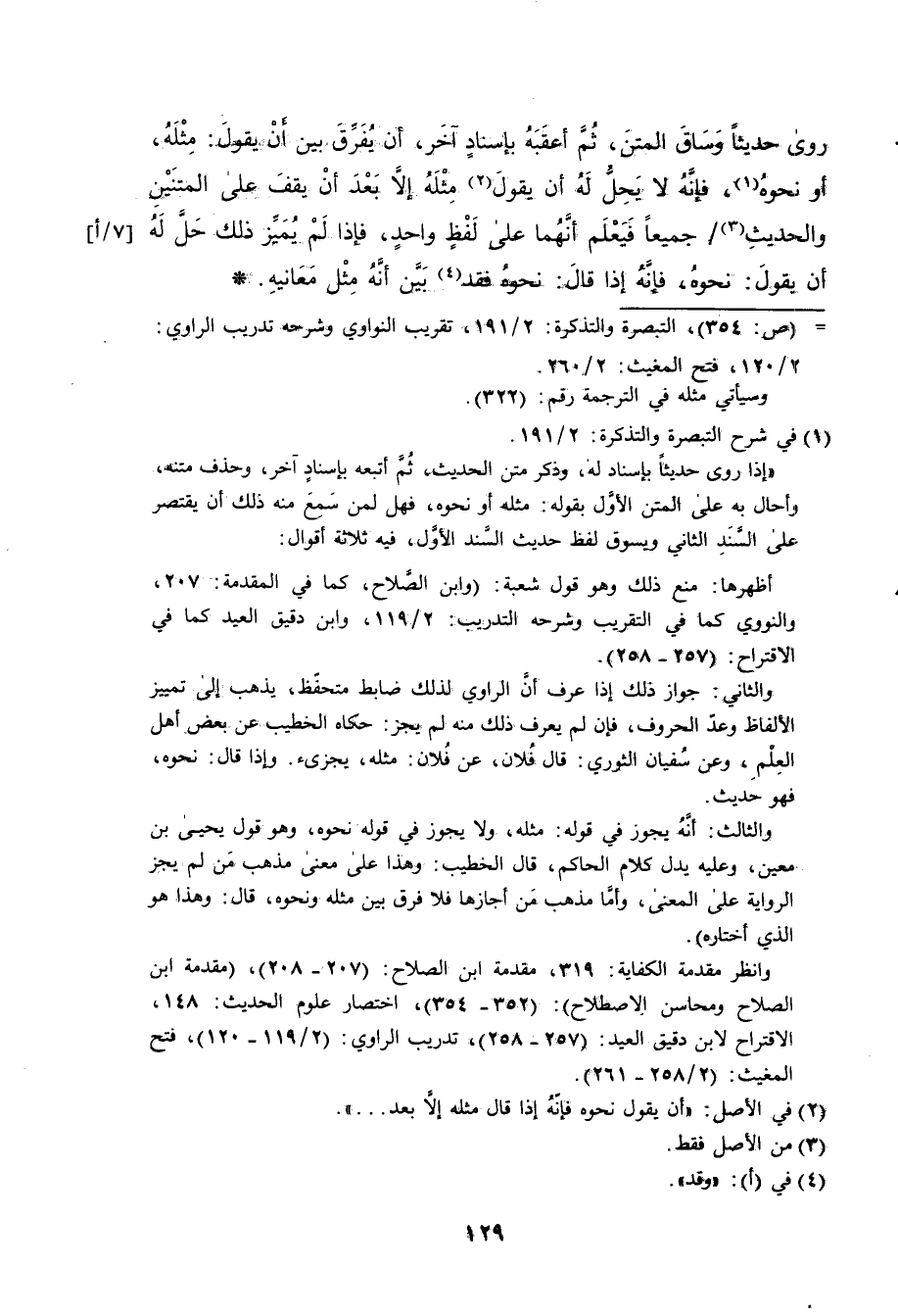 روى حديثا وساق المتن ثم اعقبه باسناد آخر ان يفرقث بين ان يقول مثله او نحوه فانه لايحل له ان يقول مثله الا بعد ان يقف على المتنين والحديث جميعا فيعلم انهما على لفظ واحد فإذا لم يميز ذلك حل له ان يقول نحوه فإنه اذا قال نحوه فقد بين انه مثل معانية.