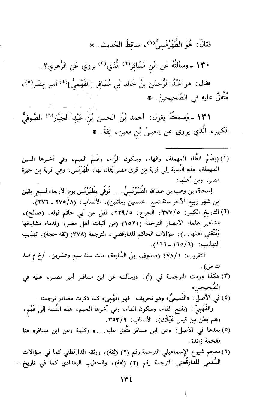 130- وسالته عن ابن مسافر الذي يروي عن الزهري