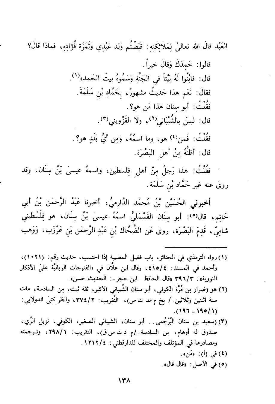 العبد قال الله تعالى لملائكته قبضتم ولد عبدي وثمر فؤاده فماذا قال قالوا حمد وقال خيرا قال فابنوا له بيتا في الجنة وسموه بيت الحمد فقال نعم هذا حديث مشهور بحماد بن سلمة فقلت ابو سنان هذا من هو