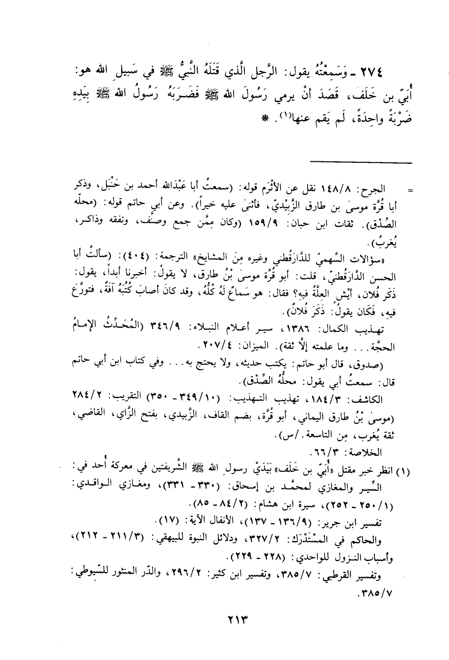 274- وسمعته يقول: الرجل الذي قتله النبي صلى الله عليه وسلم في سبيل الله هو ابي بن خلف قد ان يرمي رسول الله صلى الله عليه وسلم فضربه رسول الله صلى الله عليه وسلم بيده ضربة واحدة لم يقم عنها.