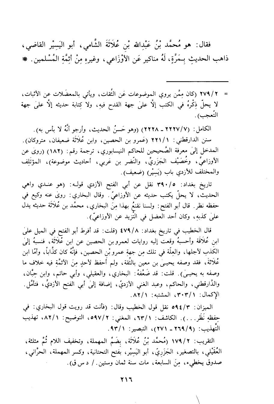 فقال هو محمد بن عبد الله بن علاثة الشامي ابو اليسير القاضي ذاهب الحديث بمرة له مناكير عن الاوزاعي وغيره من ائمة المسلمين