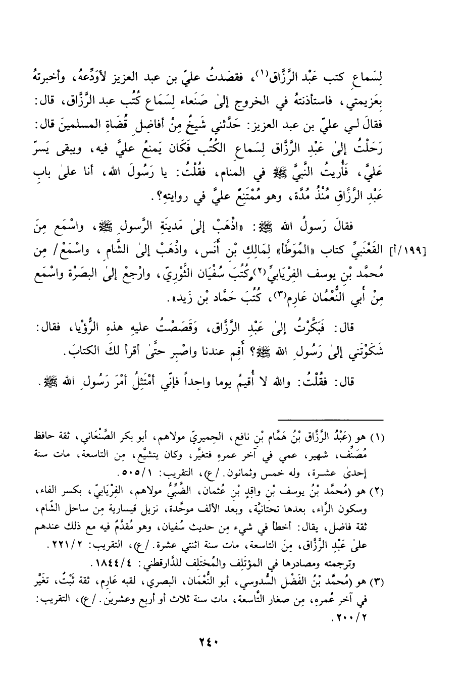 لسماع كتب عبد الرزاق فقصدت علي بن عبد العزيز لأودعه واخبرته بعزيمتي فاستاذنته في الخروج الى صنعاء لسماع كتب عبد الرزاق قال فقال لي علي بن عبد العزيز حدثني شيخ من افاضل قضاة المسلمين قال رحلت الى عبد الرزاق لسماع الكتب فكان يمنع على فيه ويبقى سر علي فأريت النبي صلى الله عليه وسلم في المنام فقلت يا رسول الله انا على باب عبد الرزاق منذ مدة وهو ممتنع علي في روايته
