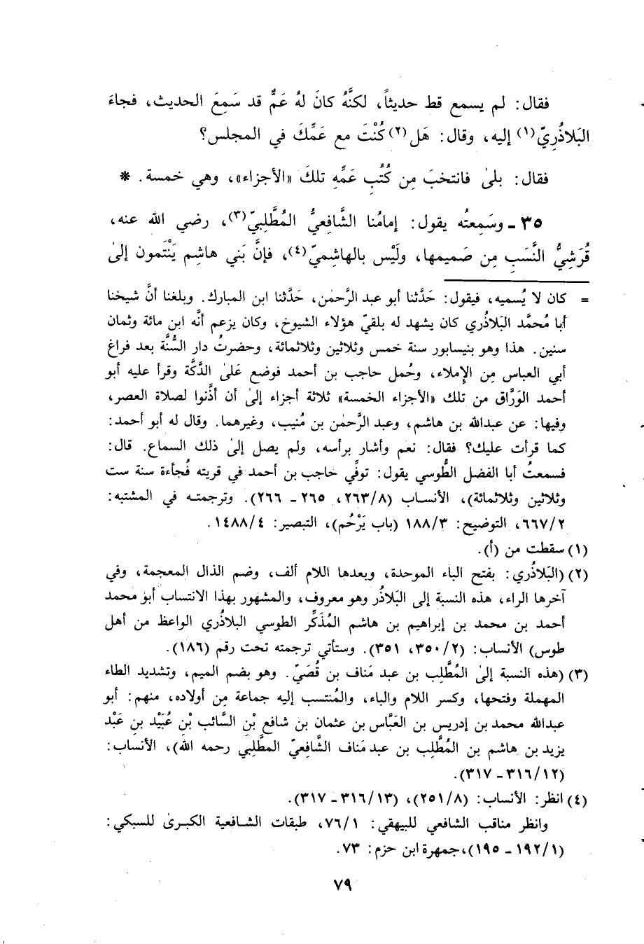 35- وسمعته يقول امامنا الشافعي المطلبي رضي الله عنه قرشي النسب من صميمها وليس بالهاشمي فإن بني هاشم ينتمون إلى