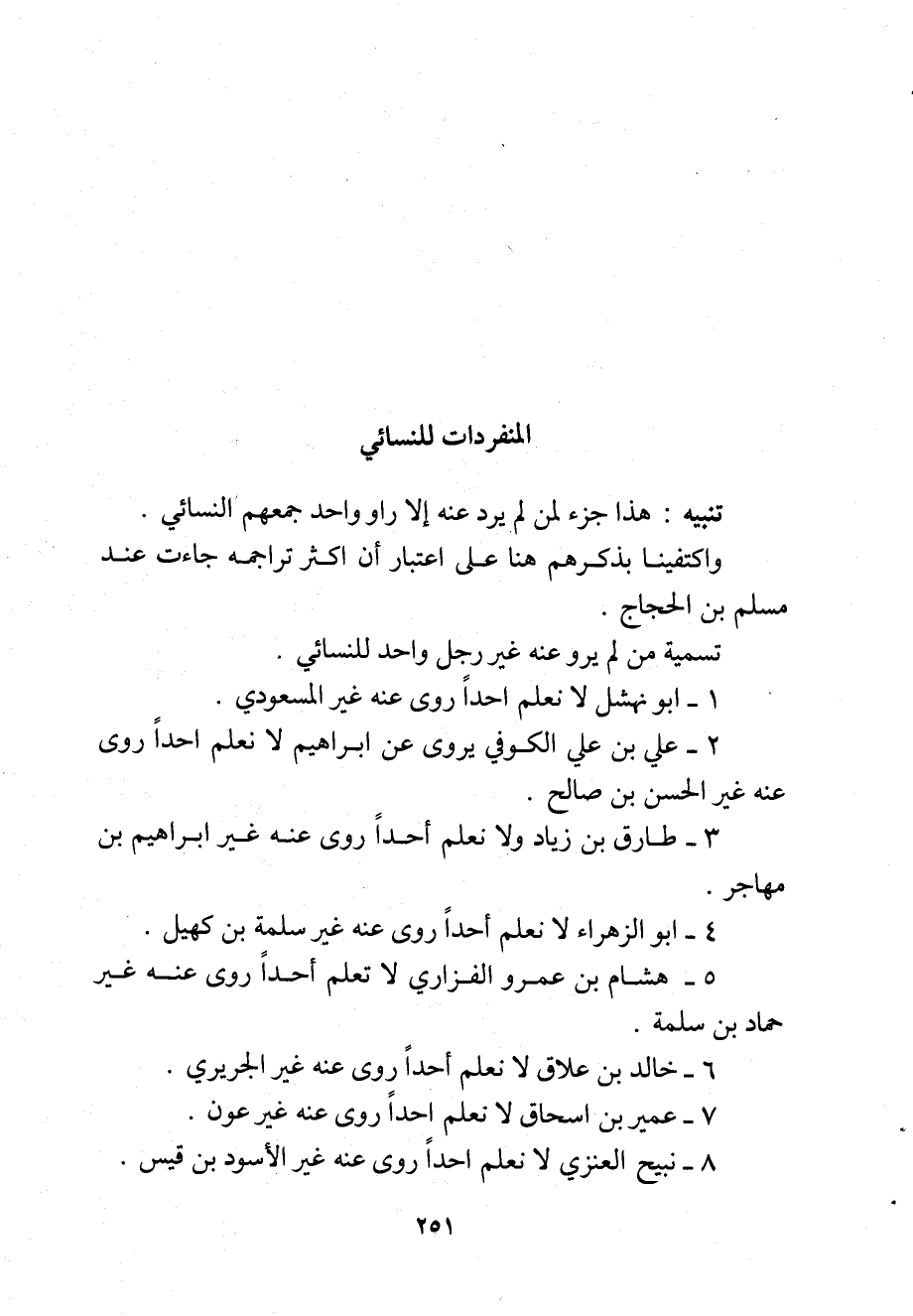 تَنْبِيه هَذَا جُزْء لمن لم يرد عَنهُ إِلَّا راو وَاحِد جمعهم النَّسَائِيّ واكتفينا بذكرهم هُنَا على اعْتِبَار أَن أَكثر تراجمه جَاءَت عِنْد مُسلم بن الْحجَّاج
