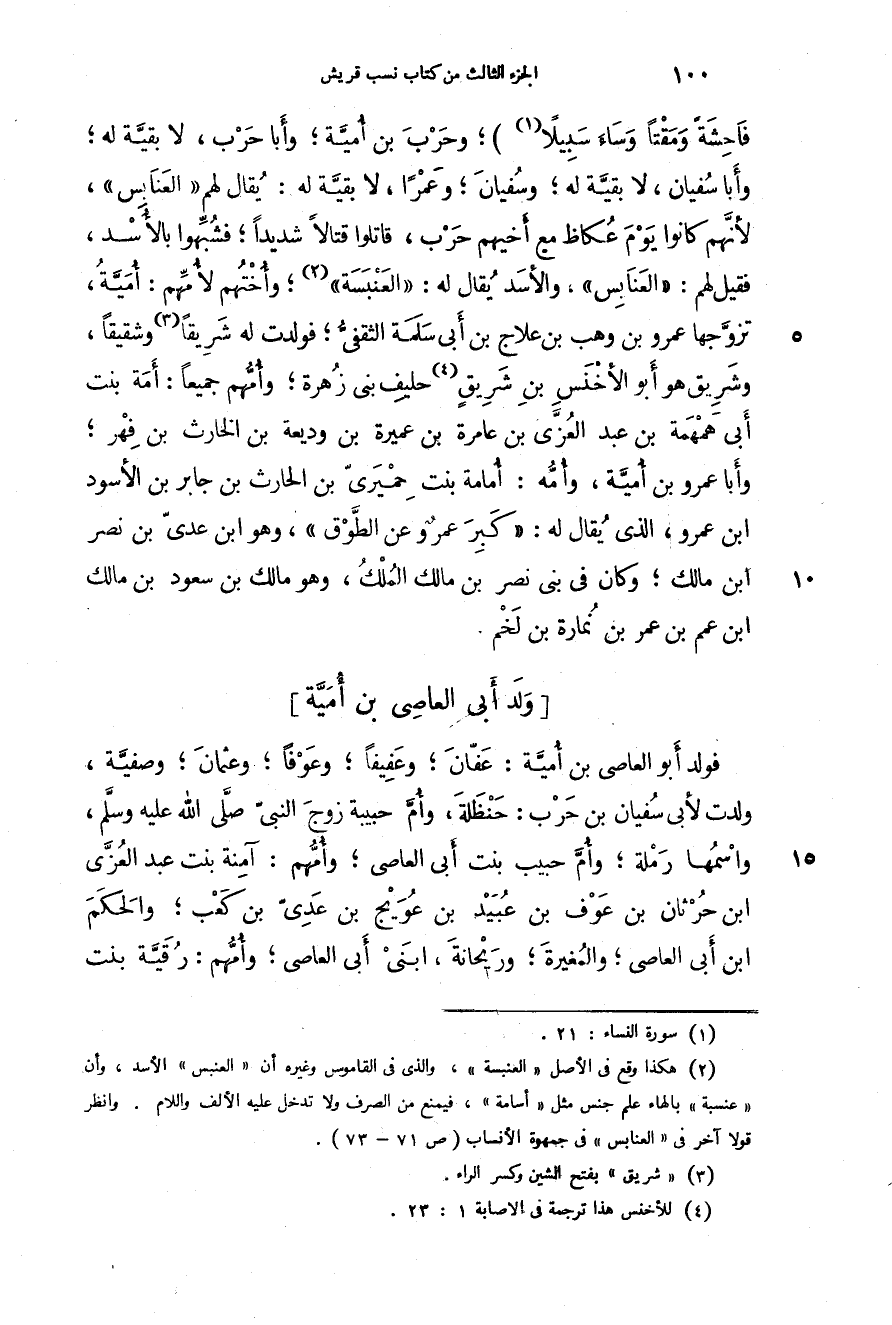 فاحشةً ومقتاً وساء سبيلا "؛ وحرب بن أمية؛ وأبا حرب، لا بقية له؛ وأبا سفيان، لا بقية له؛ وسفيان؛ وعمراً، لا بقية له: يقال لهم " العنابس "، لأنهم كانوا يوم عكاظ مع أخيهم حرب، قاتلوا قتالاً شديداً؛ فشبهوا بالأسد، فقيل لهم: " العنابس "، والأسد يقال له: " العنبسة "؛ وأختهم لأمهم: أمية، تزوجها عمرو بن وهب ابن علاج بن أبي سلمة الثقفي؛ فولدت له شريقاً وشقيقاً، وشريق هو أبو الأخنس بن شريق حليف بن زهرة؛ وأمهم جميعاً: أمة بنت أبي همهمة بن عبد العزى بن عامرة بن عميرة بن وديعة بن الحارث بن جابر بن الأسود بن عمرو، الذي يقال له: " كبر عمرو عن الطوق "، وهو ابن عدي بن نصر بن مالك؛ وكان في بني نصر بن مالك الملك، وهو مالك بن سعود بن مالك ابن عمم بن عمر بن نمارة بن لخم.