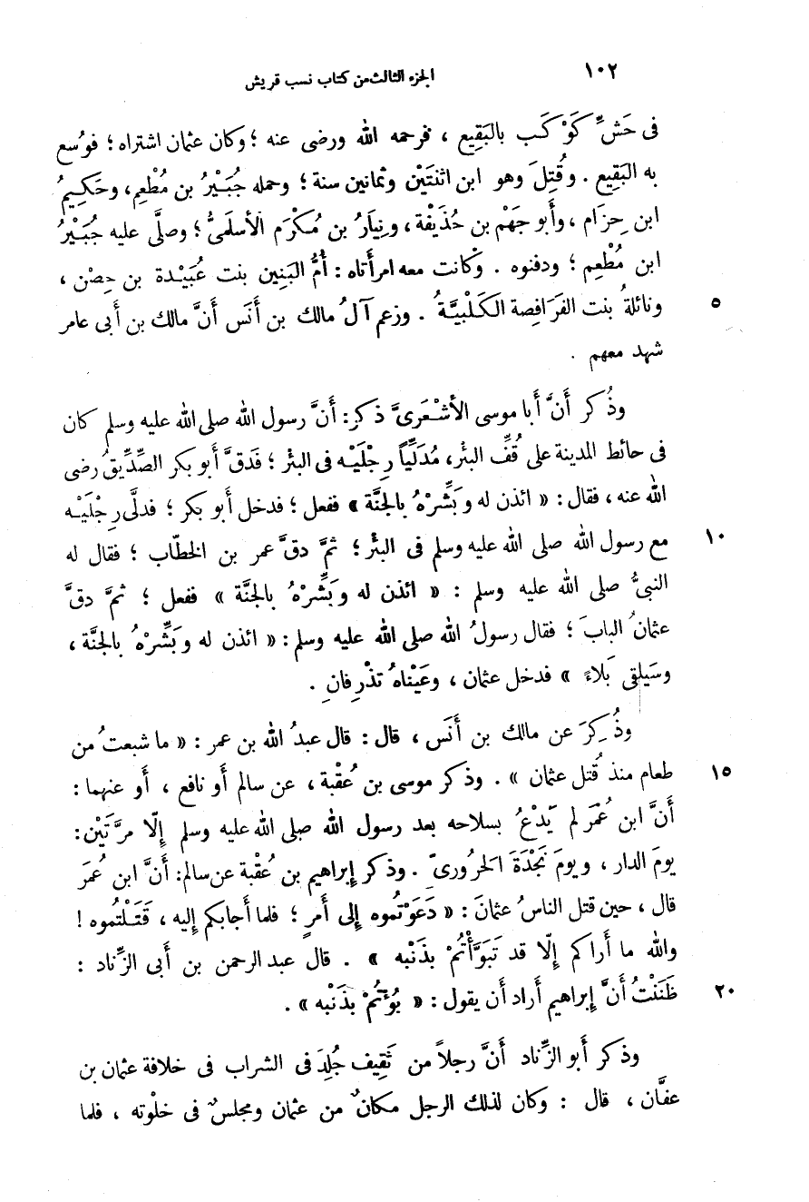 وذكر أن أبا موسى الأشعري ذكر: أن رسول الله صَلَّى اللهُ عَلَيْهِ وَسَلَّمَ كان في حائط المدينة على قف البئر، مدلياً رجليه في البئر؛ فدق أبو بكر الصديق رضي الله عنه، فقال: " ائذن له وبشره بالجنة " ففعل؛ فدخل أبو بكر؛ فدلى رجليه مع رسول الله صَلَّى اللهُ عَلَيْهِ وَسَلَّمَ في البئر؛ ثم دق عمر بن الخطاب؛ فقال له النبي صَلَّى اللهُ عَلَيْهِ وَسَلَّمَ: " ائذن له وبشره بالجنة " ففعل؛ ثم دق عثمان الباب؛ فقال رسول الله صَلَّى اللهُ عَلَيْهِ وَسَلَّمَ: " ائذن له وبشره بالجنة، وسيلقى بلاء " فدخل عثمان، وعيناه تذرفان.