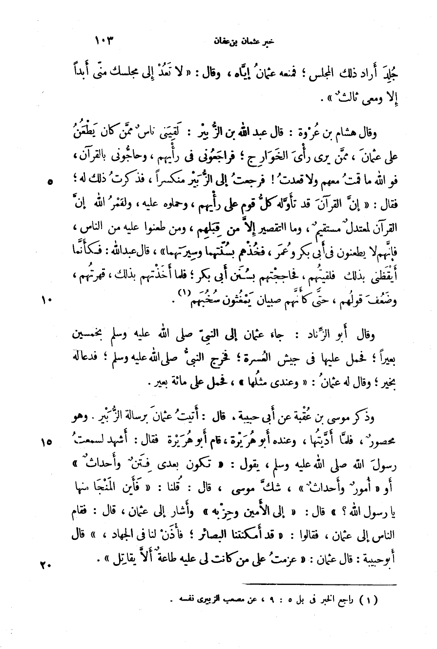 وذكر موسى بن عقبة عن أبي حبيبة، قال: أتيت عثمان برسالة الزبير. وهو محصورن فلما أديتها، وعنده أبو هريرة، قام أبو هريرة فقال: أشهد لسمعت رسول الله صَلَّى اللهُ عَلَيْهِ وَسَلَّمَ، يقول: " تكون بعدي فتن وأحداث " أو " أمور وأحداث "، شك موسى، قال: قلنا: " فأين المنجا منها يا رسول الله؟ " قال: " إلى الأمين وحزبه " وأشار إلى عثمان، قال: فقام الناس إلى عثمان، فقالوا: " قد أمكنتنا البصائر؛ فأذن لنا في الجهاد، " قال أبو حبيبة: قال عثمان: " عزمت على من كانت لي عليه طاعة ألا يقاتل ".