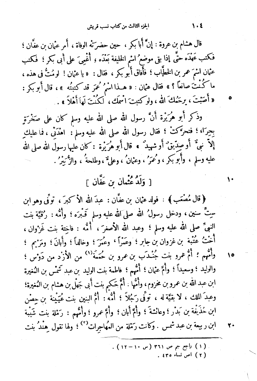 قال مصعب: فولد عثمان بن عفان: عبد الله الأكبر، توفي وهو ابن ست سينين، ودخل رسول الله صَلَّى اللهُ عَلَيْهِ وَسَلَّمَ قبره؛ وأمه: رقية بنت النبي صَلَّى اللهُ عَلَيْهِ وَسَلَّمَ؛ وعبد الله الأصغر، أمه: فاخته بنت غزوان، أخت عتبة بن غزوان بن جابر؛ وعمراً، وعمر؛ وخالداً؛ وأبان؛ ومريم؛ وأمهم: أم عمرو بنت جندب بن عمرو بن حممة من الأزد من دوس؛ والوليد؛ وسعيداً؛ وأم عثمان؛ أمهم؛ فاطمة بنت الوليد بن عبد شمس بن المغيرة بن عبد الله بن عمرو بن مخزوم، وأمها: أم حكيم بنت أبي جهل بن هشام بن المغيرة؛ وعبد الملك، لا بقية له، توفي رجلاً؛ أمه: أم البنين بنت عيينة بن حصن بن حذيفة بن بدر؛ وعائشة؛ وأم أبان؛ وأم عمرو؛ وأمهم: رملة بنت شيبة بن ربيعة بن عبد شمس. وكانت رملة من المهاجرات؛ ولها تقول هند بنت