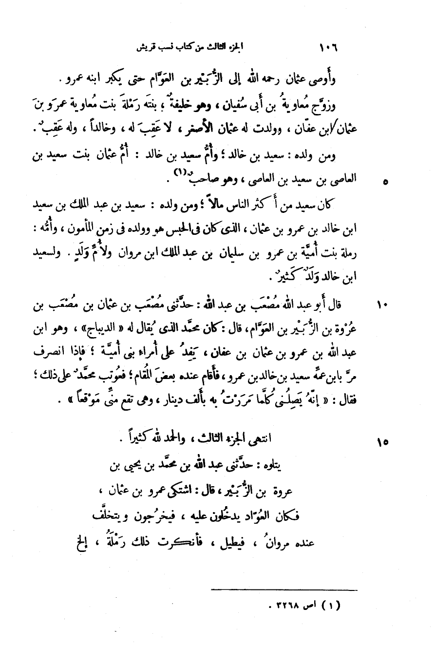 قال أبو عبد الله مصعب بن عبد الله: حدثني مصعب بن عثمان بن مصعب بن عروة بن الزبير بن العوام، قال: كان محمد الذي يقال له " الديباج "، وهو ابن عبد الله بن عمرو بن عثمان بن عفان، يفد على أمراء بني أمية؛ فإذا انصرف مر بابن عمه سعيد بن خالد بن عمرو، فأقام عنده بعض المقام؛ فعوتب محمد على ذلك؛ فقال: " إنه يصلني كلما مررت به بألف دينار، وهي تقع مني موقعاً ".