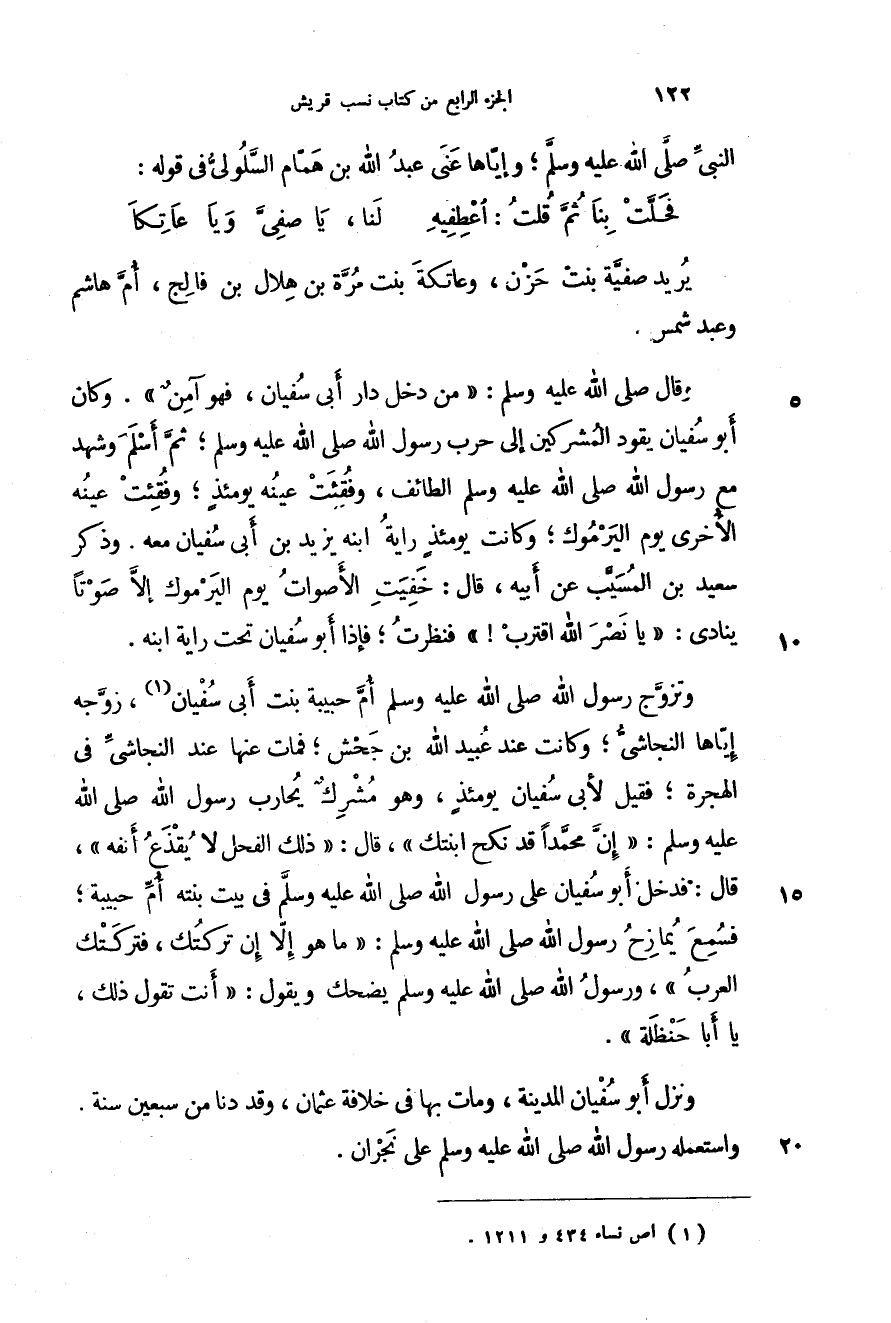 وتزوج رسول الله صَلَّى اللهُ عَلَيْهِ وَسَلَّمَ أم حبيبة بنت أبي سفيان، زوجه إياها النجاشي؛ وكانت عند عبيد الله بن جحش؛ فمات عنها النجاشي في الهجرة؛ فقيل لأبي سفيان يومئذ، وهو مشرك يحارب رسول الله صَلَّى اللهُ عَلَيْهِ وَسَلَّمَ: " إن محمداً قد نكح ابنتك "، قال: " ذلك الفحل لا يقذع أنفه "، قال: فدخل أبو سفيان على رسول الله صَلَّى اللهُ عَلَيْهِ وَسَلَّمَ في بيت بنته أم حبيبة؛ فسمع يمازح رسول الله صَلَّى اللهُ عَلَيْهِ وَسَلَّمَ: " ما هو إلا أن تركتك العرب "، فترك العرب رسول الله صَلَّى اللهُ عَلَيْهِ وَسَلَّمَ يضحك ويقول: " أنت تقول ذلك، يا أبا حنظلة ".