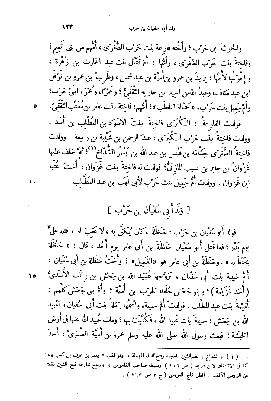 فولد أبو سفيان بن حرب: حنظلة، كان يكنى به، لا عقب له، قتله على يوم بدر؛ فلما قتل أبو سفيان حنظلة بن أبي عامر يوم أحد، قال: " حنظلة بحنظلة ". وحنظلة بن أبي عامر هو " الغسيل "؛ وأخت حنظلة بن أبي سفيان: أم حبيبة بنت أبي سفيان، تزوجها عبيد الله بن جحش بن رئاب الأسدي أسد خزيمة؛ وبنو جحش حلفاء لحرب بن أمية؛ وأم بني جحش كلهم: أميمة بنت عبد المطلب. فولدت أم حبيبة، واسمها رملة بنت أبي سفيان، لعبيد الله بن جحش: حبيبة بنت عبيد الله، فكنيت بها؛ ومات عبيد الله عنها في أرض الحبشة؛ فبعث رسول الله صَلَّى اللهُ عَلَيْهِ وَسَلَّمَ عمرو بن أمية الضمري، أحد