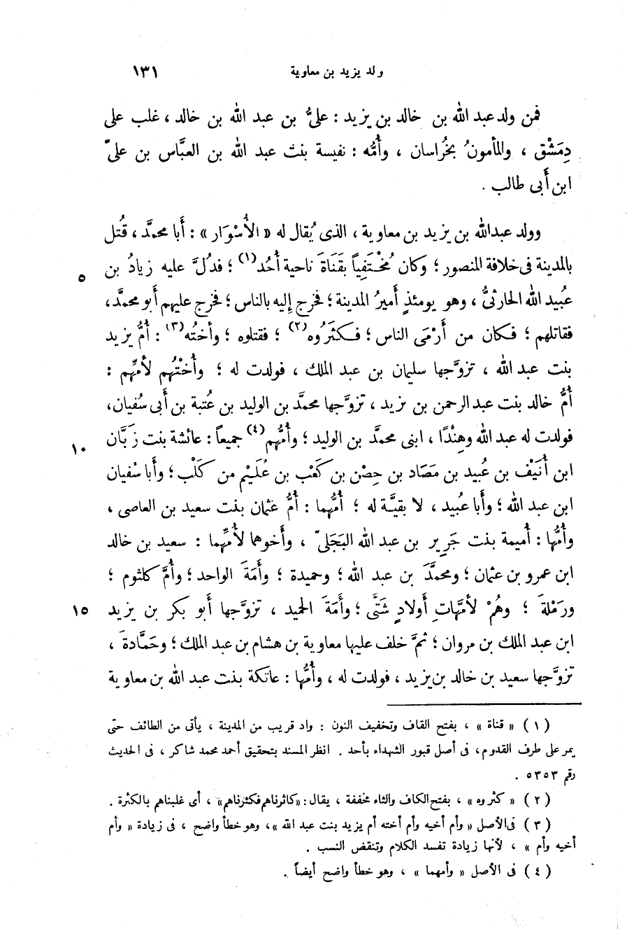 وولد عبد الله بن يزيد بن معاوية، الذي يقال له " الأسوار ": أبا محمد، قتل بالمدينة في خلافة المنصور؛ وكان مختفياً بقناة ناحية أحد؛ فدل عليه زياد بن عبيد الله الحارثي، وهو يومئذ أمير المدينة؛ فخرج إليه بالناس؛ فخرج عليهم أبو محمد، فقاتلهم؛ فكان من أرمى الناس؛ فكثروه؛ فقتلوه؛ وأخته: أم يزيد بنت عبد الله، تزوجها سليمان بن عبد الملك، فولدت له؛ وأختهم لأمهم: أم خالد بنت عبد الرحمن بن يزيد، تزوجها محمد بن الوليد بن عتبة بن أبي سفيان، فولدت له عبد الله وهنداً، ابني محمد بن الوليد؛ وأمهم جميعاً: عائشة بنت زبان بن أنيف بن عبيد بن مصاد بن حصن بن كعب بن عليم من كلب؛ وأبا سفيان بن عبد الله؛ وأبا عبيد، لا بقية له؛ أمهما: أم عثمان بنت سعيد بن العاصي، وأمها: أميمة بنت جرير بن عبد الله البجلي، وأخوهما لأمهما: سعيد بن خالد بن عمرو بن عثمان؛ ومحمد بن عبد الله؛ وحميدة؛ وأمه الواحد؛ وأم كلثوم؛ ورملة؛ وهم لأمهات أولاد شتى؛ وأمه الحميد، تزوجها أبو بكر بن يزيد بن عبد الملك ابن مروان؛ ثم خلف عليها معاوية بن هشام بن عبد الملك؛ وحمادة، تزوجها سعيد بن خالد بن يزيد، فولدت له، وأمها: عاتكة بنت عبد الله بن معاوية