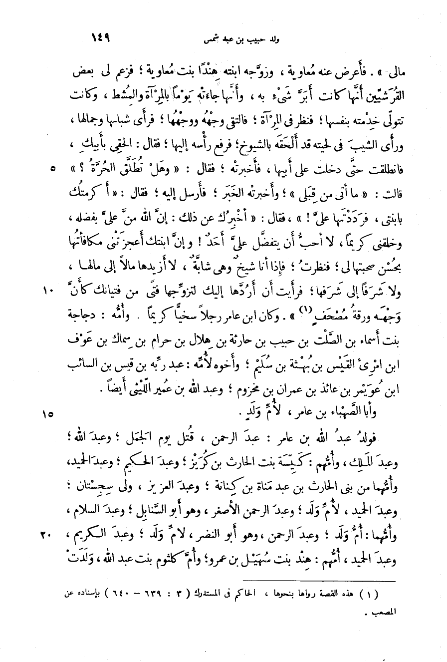 مالي. " فأعرض عنه معاوية، وزوجه ابنته هنداً بنت معاوية؛ فزعم لي بعض القرشيين أنها كانت أبر شيء به، وأنها جاءته يوماً بالمرآة والمشط، وكانت تتولى خدمته بنفسها؛ فنظر في المرآة؛ فالتقى وجهه ووجهها؛ فرأى شبابها وجمالها، ورأى الشيب في لحيته قد ألحقه بالشيوخ؛ فرفع رأسه إليها؛ فقال: الحقي بأبيك، فانطلقت حتى دخلت على أبيها، فأخبرته؛ فقال: " وهل تطلق المرأة الحرة؟ " قالت: " ما أتى من قبلي "؛ وأخبرته الخبر؛ فأرسل إليه فقال: " أكرمتك بابنتي، فرددتها علي! "، فقال: " أخبرك عن ذلك: إن الله من علي بفضله، وخلقني كريماً، لا أحب أن يتفضل علي أحد! وإن ابنتك أعجزتني مكافأتها بحسن صحبتها لي؛ فنظرت؛ فإذا أنا شيخ وهي شابة، لا أزيدها مالاً إلى مالها، ولا شرفاً إلى شرفها؛ فرأيت أن أردها إليك لتزوجها فتىً من فتيانك كأن وجهه ورقة مصحف ". وكان ابن عامر رجلاً سخياً كريماً. وأمه: دجاجة بنت أسماء بن الصلت بن حبيب بن حارثة ابن هلال بن حرام بن سماك بن عوف بن امرئ القيس بن بهثة بن سليم؛ وأخوه لأمه: عبد ربه بن قيس بن السائب بن عويمر بن عائذ بن عمران بن مخزوم؛ وعبد الله بن عمير الليثي أيضاً.