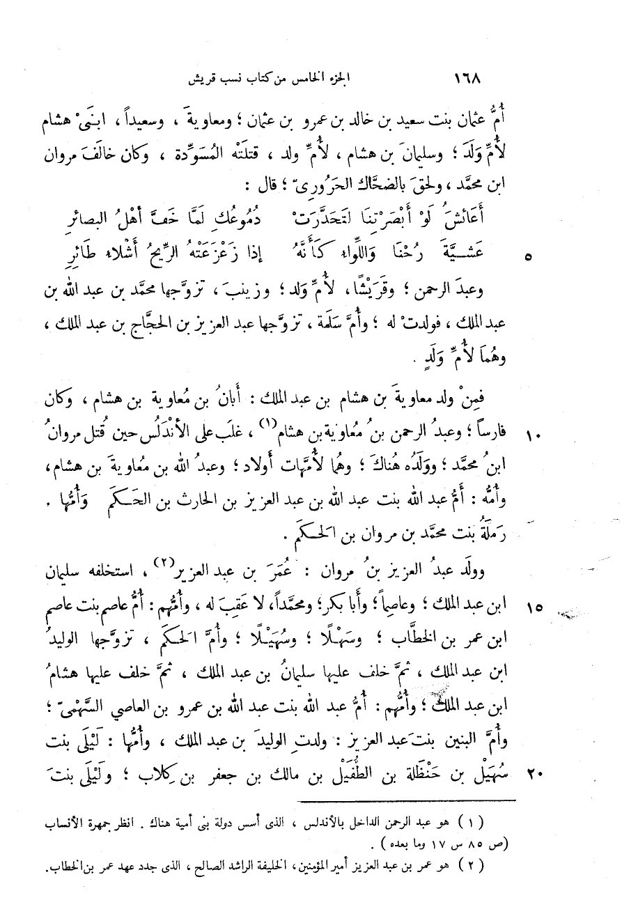فمن ولد معاوية بن هشام بن عبد الملك: أبان بن معاوية بن هشام، وكان فارساً؛ وعبد الرحمن بن معاوية بن هشام، غلب على الأندلس حين قتل مروان بن محمد؛ وولد هناك؛ وهما لأمهات أولاد؛ وعبد الله بن معاوية بن هشام، وأمه: أم عبد الله بنت عبد الله بن عبد العزيز بن الحارث بن الحكم وأمها. رملة بنت محمد بن مروان بن الحكم.