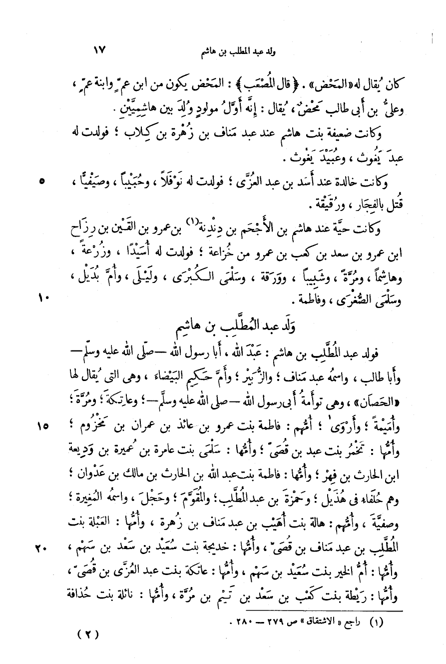 فولد عبد المطلب بن هاشم: عبد الله، أبا رسول الله - صَلَّى اللهُ عَلَيْهِ وَسَلَّمَ - وأبا طالب، واسمه عبد مناف؛ والزبير؛ وأم حكيم البيضاء، وهي التي يقال لها " الحصان "، وهي توأمة أبي رسول الله - صلى الله عله وسلم -؛ وعاتكة؛ ومرة؛ وأميمة؛ وأروى؛ أمهم: فاطمة بنت عمرو بن عائذ بن عمران بن مخزوم؛ وأمها: تخمر بنت عبد بن قصي؛ وأمها: سلمى بنت عامرة بن عميرة بن وديعة ابن الحارث بن فهر؛ وأمها: فاطمة بنت عبد الله بن الحارث بن مالك بن عدوان؛ وهم حلفاء في هذيل؛ وحمزة بن عبد المطلب؛ والمقوم؛ وحجل، واسمه المغيرة؛ وصفية، وأمهم: هالة بنت أهيب بن عبد مناف بن زهرة، وأمها: العبلة بنت المطلب بن عبد مناف بن قصي، وأمها: خديجة بنت سعيد بن سعد بن سهم، وأمها: أم الخير بنت سعيد بن سهم، وأمها: عاتكة بنت عبد العزى بن قصي، وأمها: ريطة بنت كعب بن سعد بن تيم بن مرة، وأمها: نائلة بنت حذاقة