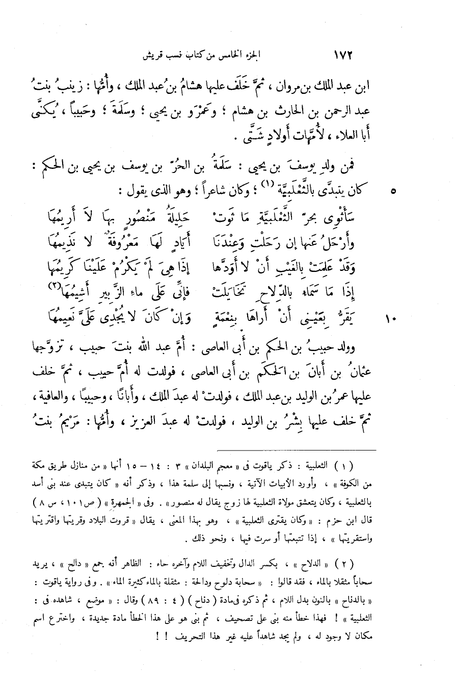 فمن ولد يوسف بن يحيى: سلمة بن الحر بن يوسف بن يحيى بن الحكم: كان يتبدى بالثعلبية؛ وكان شاعراً؛ وهو الذي يقول: