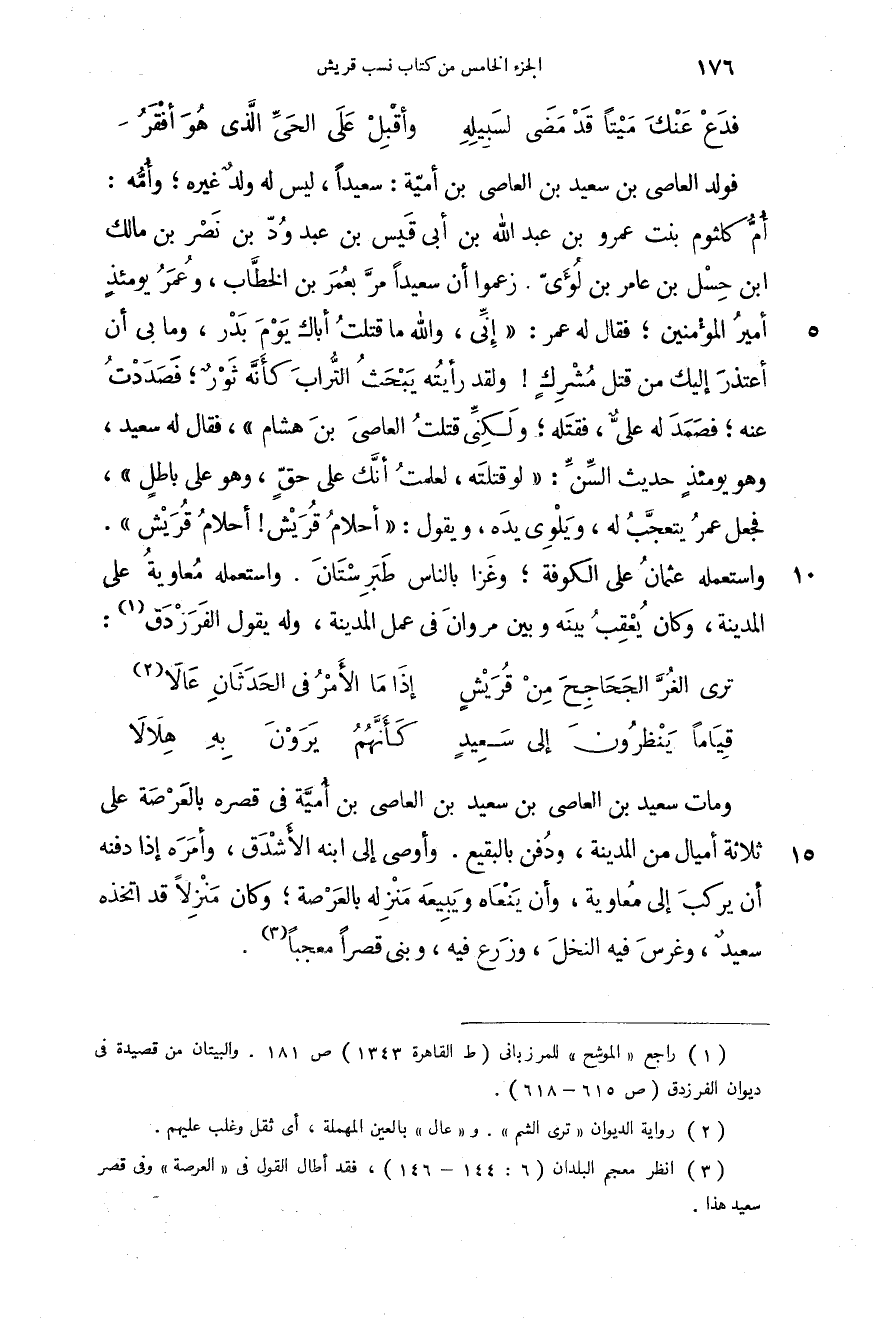 فولد العاصي بن سعيد بن أمية: سعيداً، ليس له ولد غيره؛ وأمه: أم كلثوم بنت عمرو بن عبد الله بن أبي قيس بن عبد ود بن نصر بن مالك بن حسل بن عامر بن لؤي. زعموا أن سعيداً مر بعمر بن الخطاب، وعمر يومئذ أمير المؤمنين؛ فقال له عمر: " إني، والله ما قتلت أباك يوم بدر، وما بي أن أعتذر إليك من قتل مشرك! ولقد رأيته يبحث التراب كأنه ثور؛ فصددت عنه فصمد له علي فقتله ولكني قتلت العاصي بن هشام فقال سعيد: وهو يومئذ حديث السن: " لو قتلته، لعلمت أنك على حق، وهو على باطل "، فجعل عمر يتعجب له، ويلوي يده، ويقول: " أحلام قريش! أحلام قريش ".