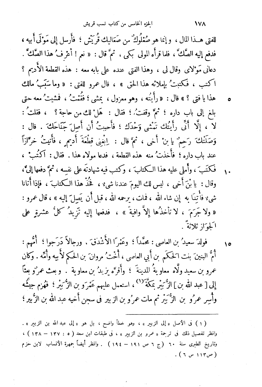 للفتى هذا المال، وإنما هو صعلوك من صعاليك قريش؛ فأرسل إلى مولى أبيه، فدفع إليه الصك، فلما قرأه المولى بكى، ثم قال: " نعم! أعرف هذا الصك. دعاني مولاي وقال لي، وهذا الفتى عنده على بابه معه: هذه القطعة الأديم؟ اكتب، فكتب بإملائه هذا الحق "، قال عمرو للفتى: " وما سبب مالك هذا يا فتى؟ " قال: " رأيته، وهو معزول، يمشي؛ فقمت، فمشيت معه حتى بلغ إلى باب داره؛ ثم وقفت؛ فقال: هل لك من حاجة؟، فقلت: لا، إلا أني رأيتك تمشي وحدك؛ فأحببت أن أصل جناحك. قال: وصلتك رحم يابن أخي، ثم قال: ابغني قطعة أديم، فأتيت خرازاً عند باب داره؛ فأخذت منه هذه القطعة، فدعا مولاه هذا. فقال: اكتب، فكتب، وأملى عليه هذا الكتاب، وكتب فيه شهادته على نفسه، ثم دفعها إلي، وقال: يابن أخي، ليس لك اليوم عندنا شيء، فخذ هذا الكتاب، فإذا أتانا شيء فأتنا به إن شاء الله، فمات، يرحمه الله، قبل أن يصل إليه "، قال عمرو: " ولا جرم، لا تأخذها إلا وافية "، فدفعها إليه تزيد كل عشرة على الجواز ثلاثة.