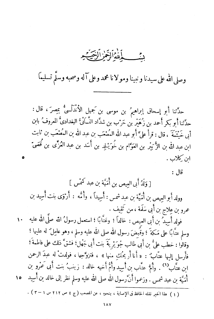 حدثنا أبو إسحاق إبراهيم بن موسى بن جميل الأندلسي بمصر، قال: حدثنا أبو بكر أحمد أبو بكر أحمد بن زهير بن حرب بن شداد النسائي البغدادي المعروف بابن أبي خيثمة، قال: قرأ علي أبو عبد الله المصعب بن عبد الله بن المصعب بن ثابت بن عبد الله بن الزبير بن العوام بن خويلد بن أسد بن عبد العزى بن قصي بن كلاب.
