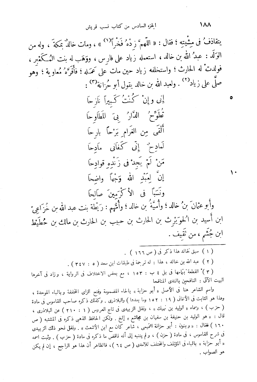 يتقاذف في مشيته؛ فقال: " اللهم زده فخراً "، ومات خالد بمكة، وله من الولد: عبد الله بن خالد، استعمله زياد على فارس، ووهب له بنت المكعبر، فولدت له الحارث؛ واستخلفه زياد حين مات على عمله؛ فأقره معاوية؛ وهو صلى على زياد. ولعبد الله بن خالد يقول أبو حزانة: