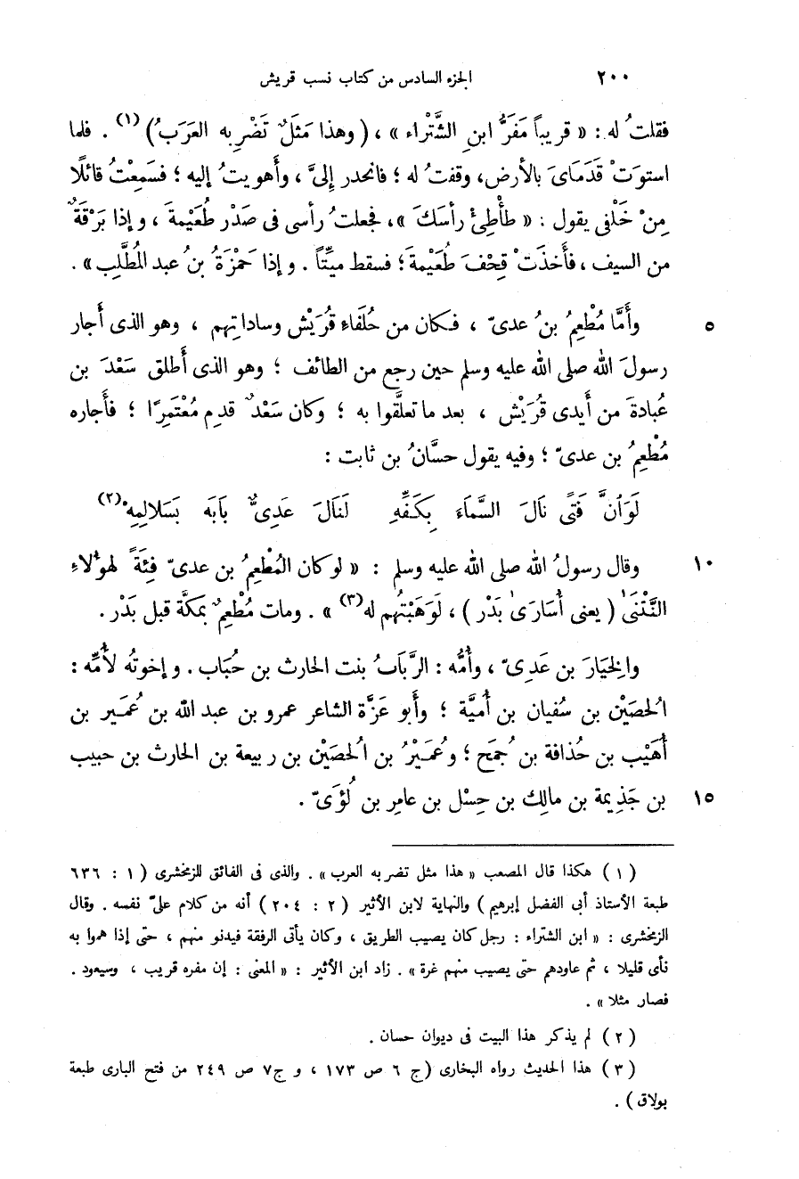 وأما مطعم بن عدي، فكان من حلفاء قريش وساداتهم، وهو الذي أجار رسول الله صَلَّى اللهُ عَلَيْهِ وَسَلَّمَ حين رجع من الطائف؛ وهو الذي أطلق سعد بن عبادة من أيدي قريش، بعدما تعلقوا به؛ وكان سعد قدم معتمراً؛ فأجاره مطعم بن عدي؛ وفيه يقول حسان بن ثابت: