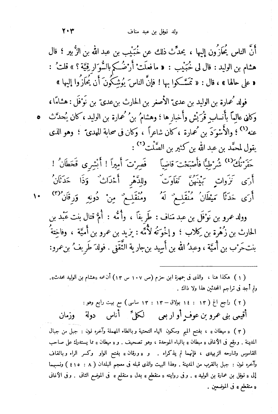 أن الناس يحازون إليها، يحدث عن خبيب بن عبد الله بن الزبير؛ قال هشام بن الوليد: قال لي خبيب: " ما فعلت أرضكم بالسوارقية؟ " قلت: " على حالها "، قال: " تمسكوا بها! فإن الناس يوشكون أن يحازوا إليها " فولد عمارة بن عدي الأصغر بن الحارث بن عدي بن نوفل: هشاماً، وكان عالماً بأنساب قريش وأخبارها؛ وهشام بن عمارة بن الوليد، كان يحدث عنه؛ والأسود بن عمارة، كان شاعراً، وكان في صحابة المهدي؛ وهو الذي يقول لمحمد بن عبد الله بن كثير بن الصلت: