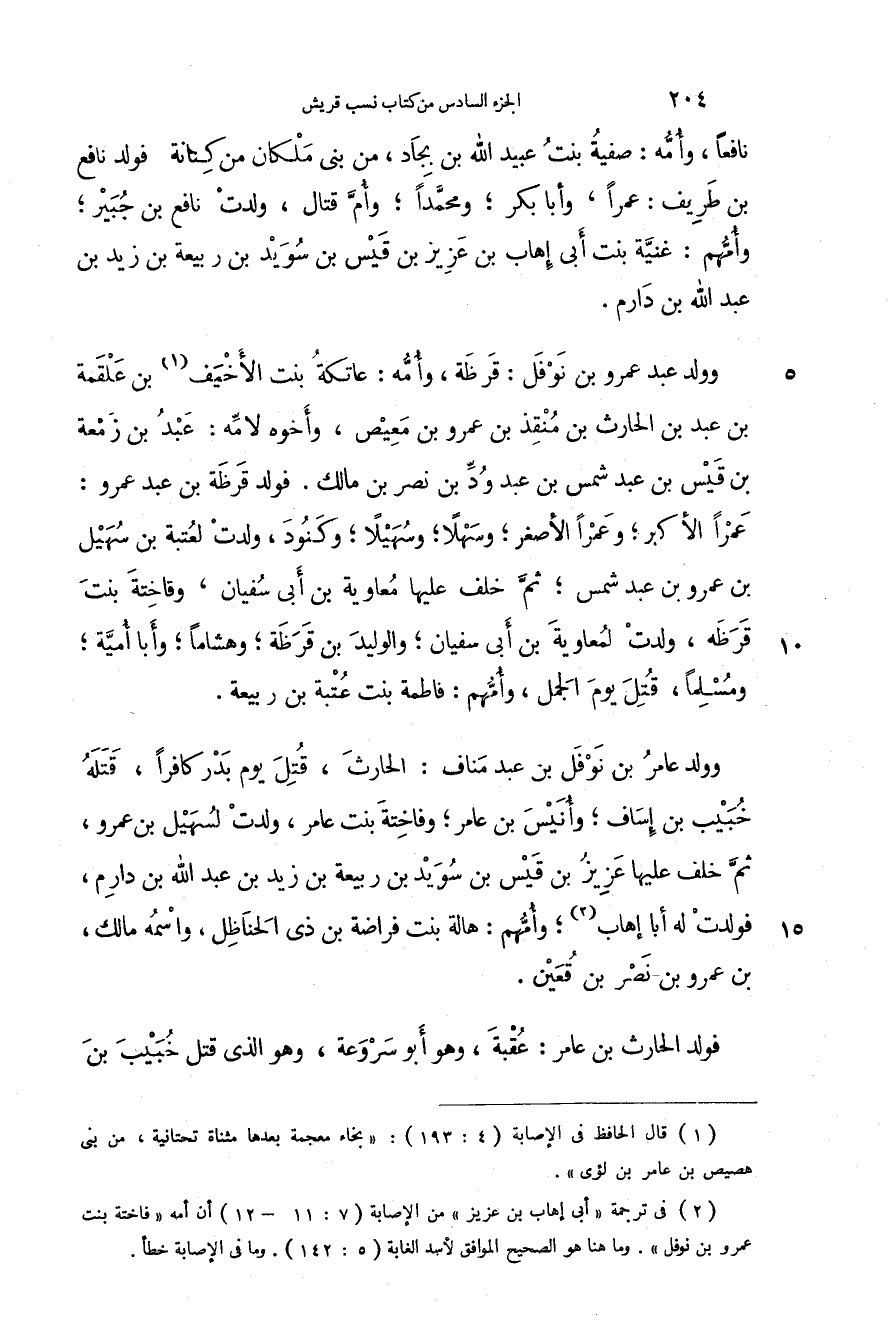 وولد عامر بن نوفل بن عبد مناف: الحارث، قتل يوم كان بدر كافراً، قتله خبيب بن إساف؛ وأنيس بن عامر؛ وفاختة بنت عامر، ولدت لسهيل بن عمرو، ثم خلف عليها عزيز بن قيس بن سويد بن ربيعة بن زيد بن عبد الله بن دارم، فولدت له أبا إهاب؛ وأمهم: هالة بنت فراضة بن ذي الحناظل، واسمه مالك، بن عمرو بن نصر بن قعين.