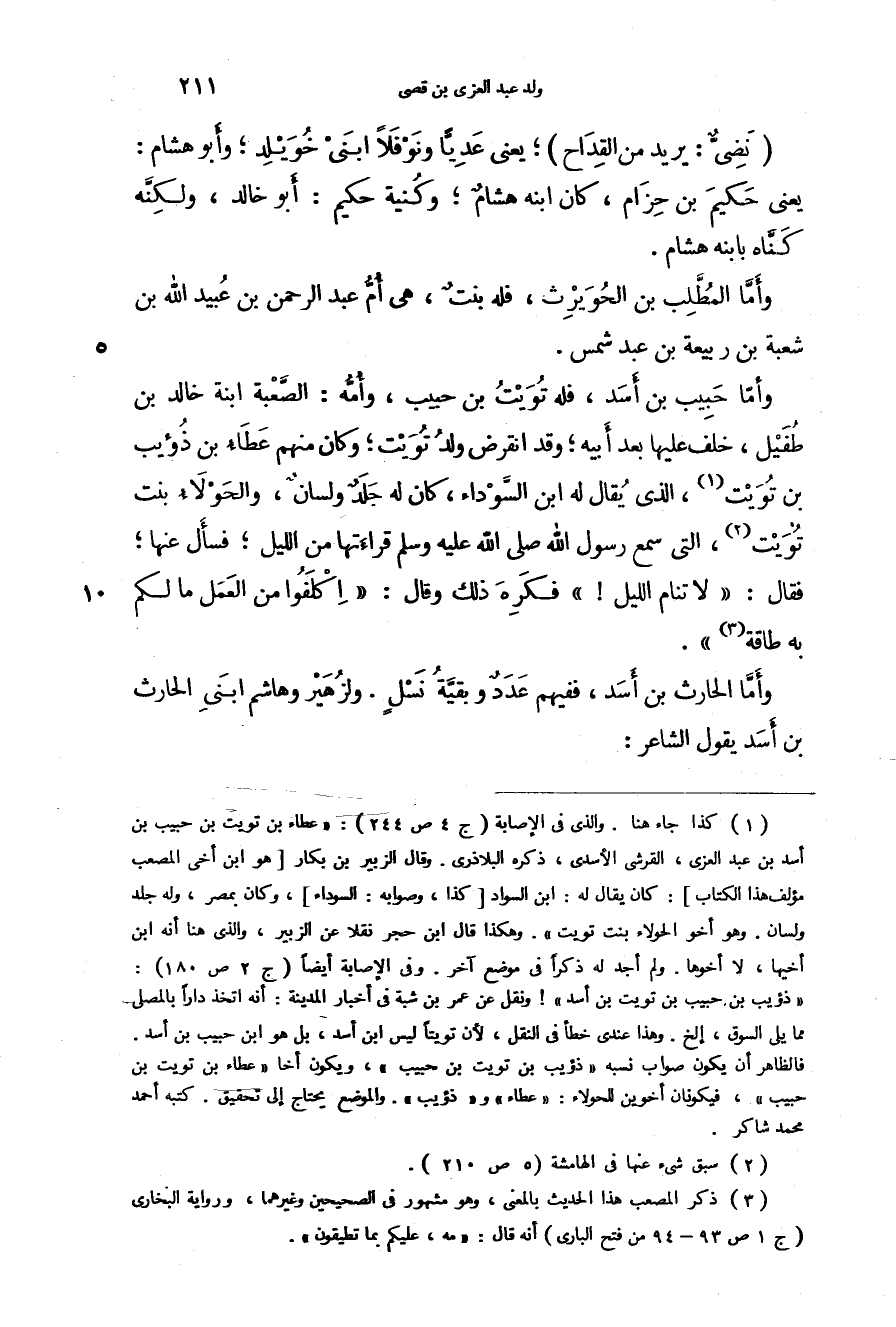وأما حبيب بن أسد، فله تويت بن حبيب، وأمه: الصعبة ابنة خالد بن طفيل، خلف عليها بعد أيبه؛ وقد انقرض ولد تويت؛ وكان منهم عطاء بن ذؤيب بن تويت، الذي يقال له ابن السوداء، كان له جلد ولسان، والحولاء بنت تويت، التي سمع رسول الله صَلَّى اللهُ عَلَيْهِ وَسَلَّمَ قراءتها من الليل؛ فسأل عنها؛ فقال: " لا تنام الليل! " فكره ذلك وقال: " اكلفوا من العمل ما لكم به طاقة ".