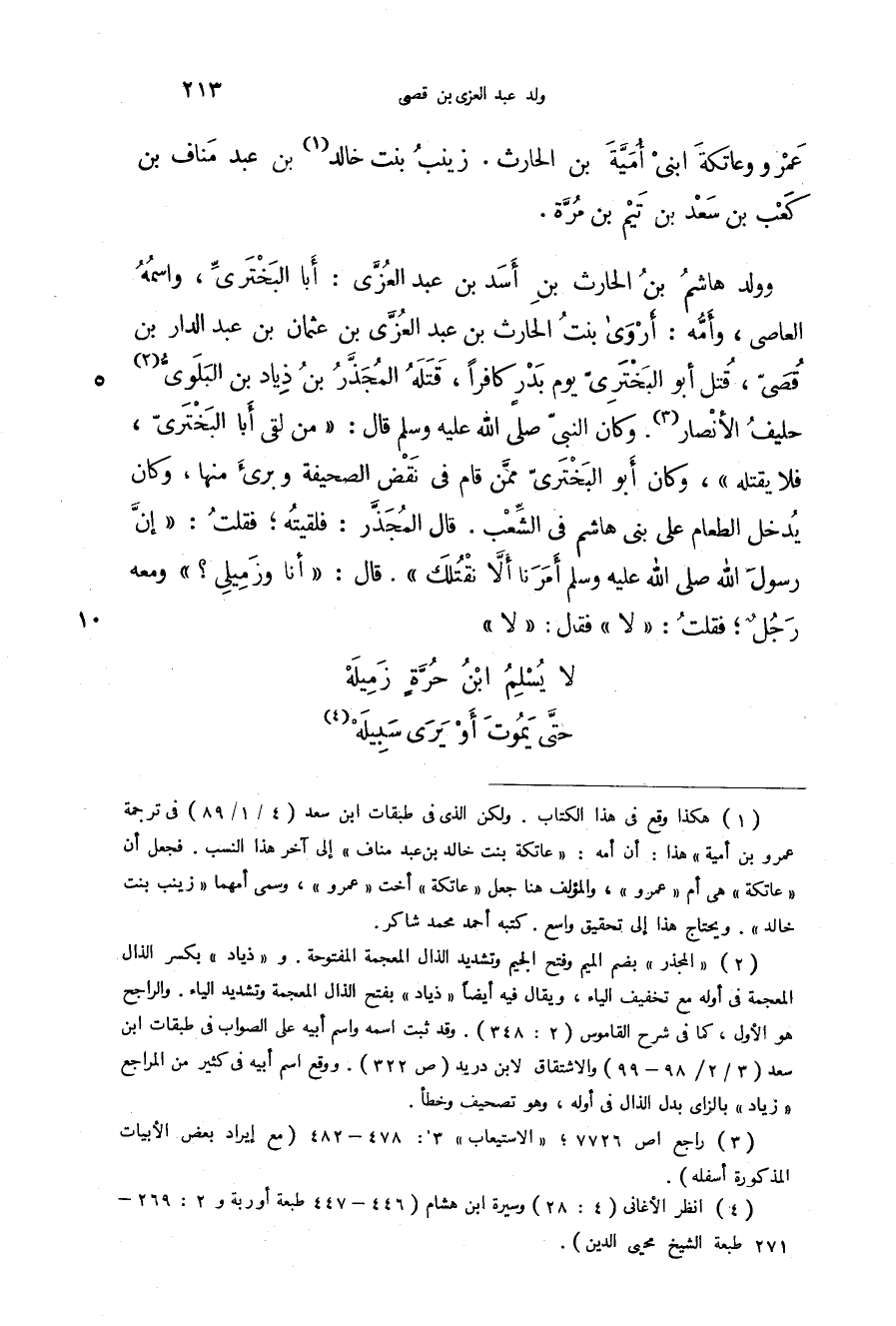وولد هاشم بن الحارث بن أسد بن عبد العزى: أبا البختري، واسمه العاصي، وأمه: أروى بنت الحارث بن عبد العزى بن عثمان بن عبد الدار بن قصي، قتل أبو البختري يوم بدر كافراً، قتله المجذر بن ذياد بن البلوي حليف الأنصار. وكان النبي صَلَّى اللهُ عَلَيْهِ وَسَلَّمَ قال: " من لقى أبا البختري، فلا يقتله "، وكان أبو البختري ممن قام في نقض الصحيفة وبرئ منها، وكان يدخل الطعام على بني هاشم في الشعب. قال المجذر: فلقيه: فقلت: " إن رسول الله صَلَّى اللهُ عَلَيْهِ وَسَلَّمَ أمرنا ألا نقتلك ". قال: " أنا وزميلي؟ " ومعه رجل؛ فقلت: " لا " فقال: " لا "