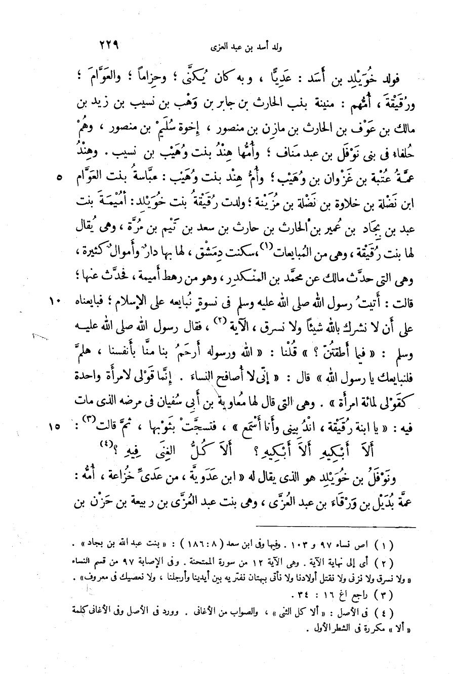 فولد خويلد بن أسد: عدياً، وبه كان يكنى؛ وحزاماً؛ والعوام؛ ورقية، أمهم: منينة بنت الحارث بن جابر بن وهب بن نسيب بن زيد بن مالك بن عوف بن الحارث بن مازن بن منصور، إخوة سليم بن منصور، وهم حلفاء في بني نوفل بن عبد مناف؛ وأمها هند بنت وهيب بن نسيب. وهند عمة عتبة بن غزوان بن وهيب؛ وأم هند بنت وهيب: عباسة بنت العوام بن نضلة بن خلاوة بن نضلة بن مزينة؛ ولدت رقيقة بنت خويلد: أميمة بنت عبد بن بجاد بن عمير بن الحارث بن حارث بن سعد بن تيم بن مرة، وهي يقال لها بنت رقيقة، وهي من المبايعات، سكنت دمشق، لها بها دار وأموال كثيرة، وهي التي حدث مالك عن محمد بن المنكدر، وهو من رهط أميمة، فحدث عنها؛ قالت: أتيت رسول الله صَلَّى اللهُ عَلَيْهِ وَسَلَّمَ في نسوة نبايعه على الإسلام؛ فبايعناه على أن لا نشرك بالله شيئاً ولا نسرق، الآية، فقال رسول الله صَلَّى اللهُ عَلَيْهِ وَسَلَّمَ: " فيما أطقتن؟ " قلنا: " الله ورسوله أرحم بنا منا بأنفسنا، هلم فلنبايعك يا رسول الله " قال: " إني لا أصافح النساء. إنما قولي لامرأة واحدة كقولي لمائة امرأة ". وهي التي قال لها معاوية بن أبي سفيان في مرضه الذي مات فيه: " يا ابنة رقيقة، اندبيني وأنا أسمع "، فتسجت بثوبها، ثم قالت: