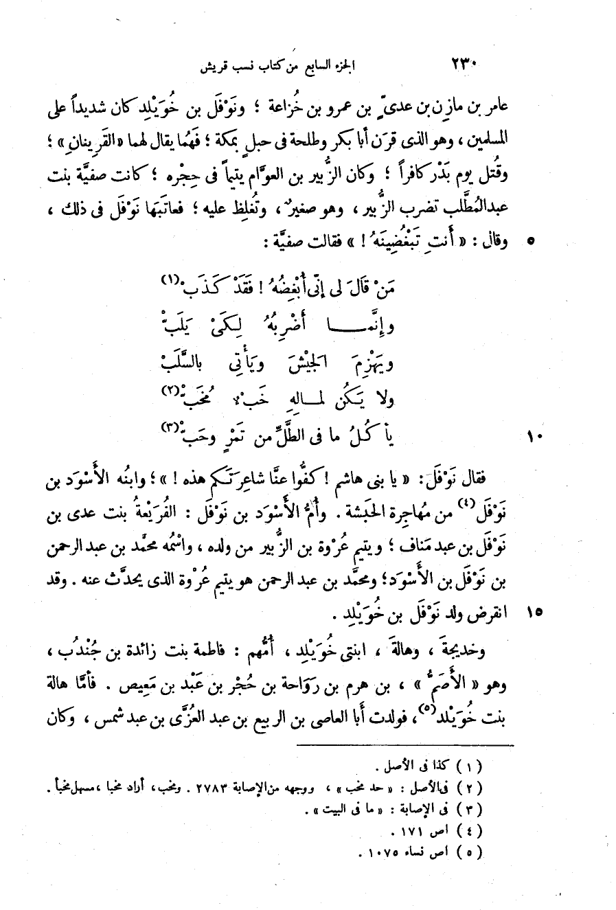 عامر بن مازن بن عدي بن عمرو بن خزاعة؛ ونوفل بن خويلد كان شديداً على المسلمين، وهو الذي قرن أبا بكر وطلحة بمكة؛ فهما يقال لهما " القريبان "؛ وقتل يوم بدر كافراً؛ وكان الزبير بن العوام يتيماً في حجره؛ كانت صفية بنت عبد المطلب تضرب الزبير، وهو صغير، وتغلظ عليه؛ فعاتبها نوفل في ذلك، وقال: " أنت تبغضيه! " فقال صفية: