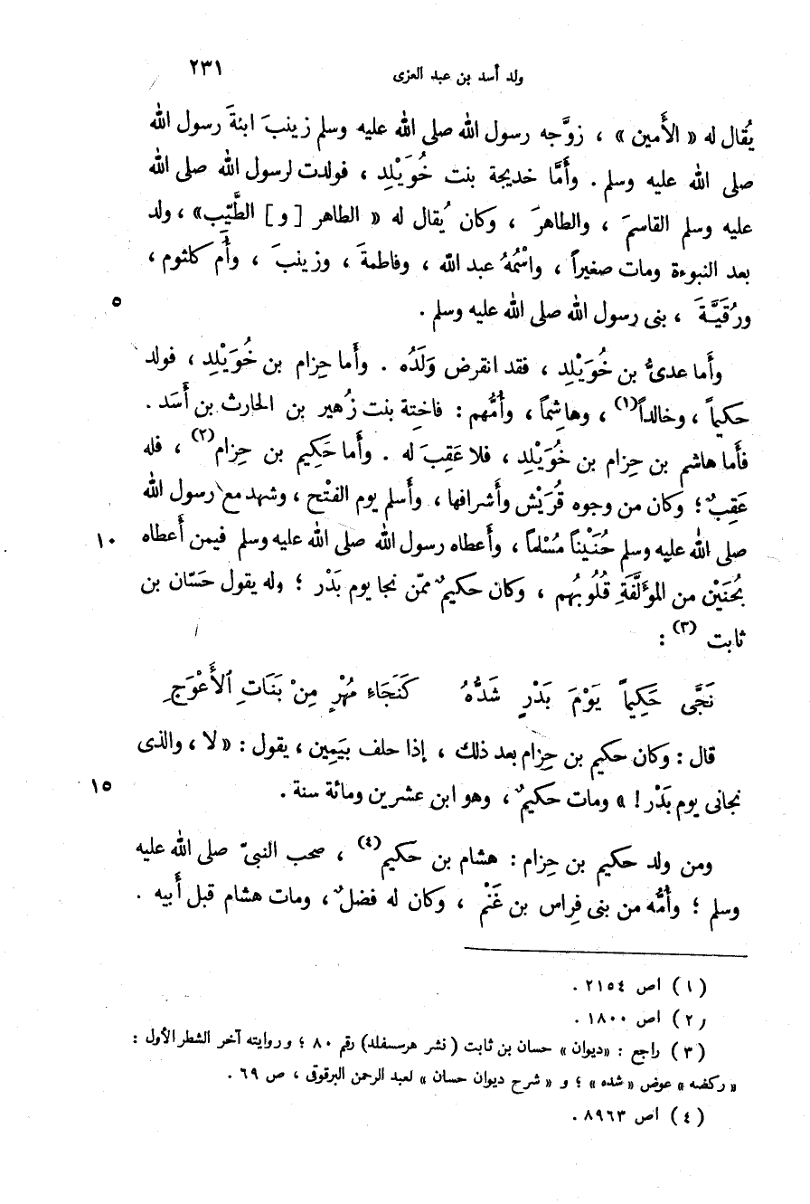 فأما هاشم بن حزام بن خويلد، فلا عقب له. وأما حكيم بن حزام، فله عقب؛ وكان من وجوه قريش وأشرافها، وأسلم يوم الفتح، وشهد مع رسول الله صَلَّى اللهُ عَلَيْهِ وَسَلَّمَ حنيناً مسلماً، وأعطاه رسول الله صَلَّى اللهُ عَلَيْهِ وَسَلَّمَ فيمن أعطاه بحنين من المؤلفة قلوبهم، وكان حكيم ممن نجا يوم بدر؛ وله يقول حسان بن ثابت: