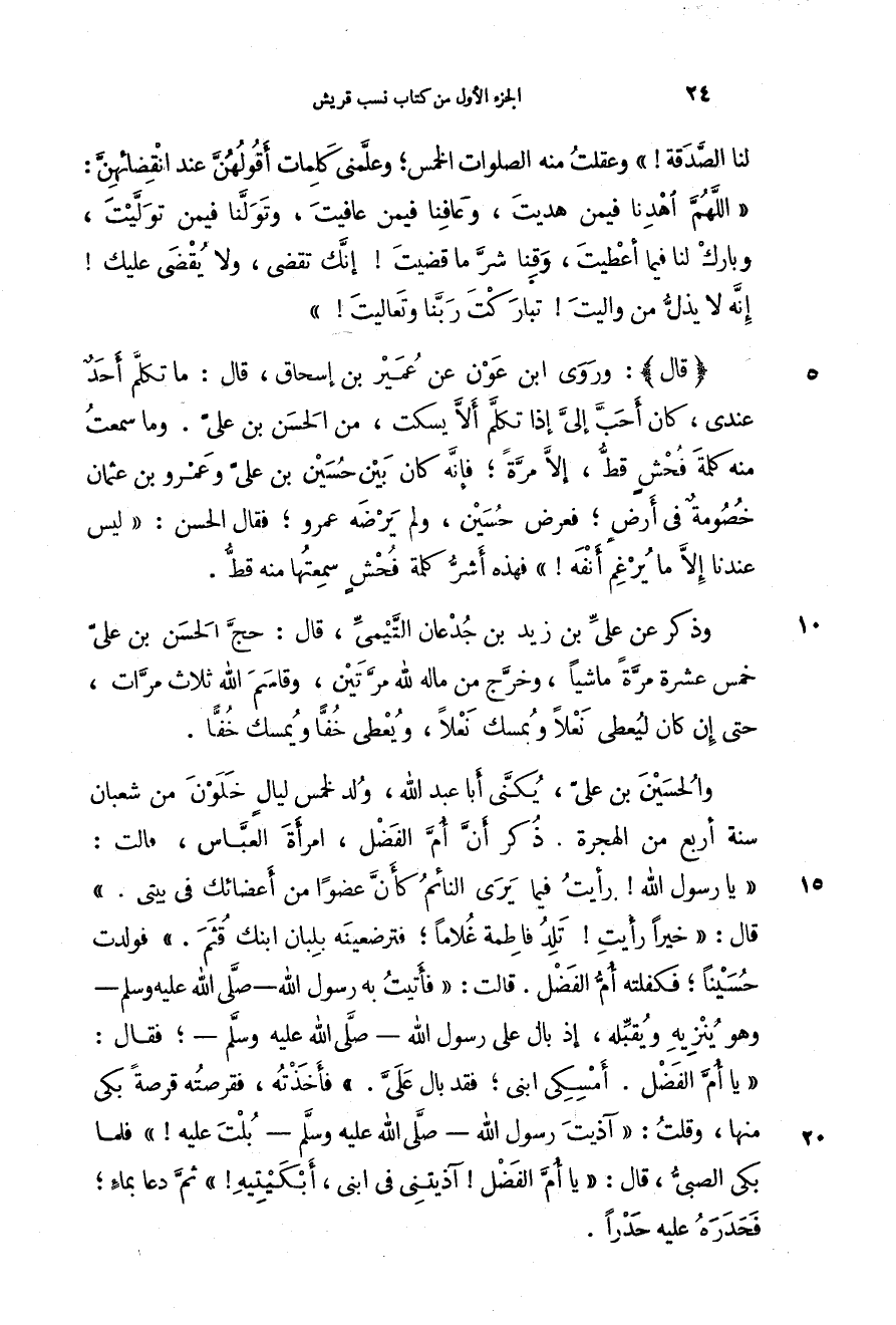 لنا الصدقة! " وعقلت منه الصلوات الخمس؛ وعلمني كلمات أقولهن عند انقضائهن: " اللهم اهدنا فيمن هديت، وعافنا فيمن عافيت، وتولنا فيمن توليت، وبارك لنا فيما أعطيت، وقنا شر ما قضيت! إنك تقضي ولا يقضى عليك! إنه لا يذل من واليت! تباركت ربنا وتعاليت! " قال: وروى ابن عون عن عمير بن إسحاق، قال: ما تكلم أحد عندي، كان أحب إلي إذا تكلم ألا يسكت، من الحسن بن علي. وما سمعت منه كلمة فحش قط، إلا مرة؛ فإنه كان بين حسين بن علي وعمرو بن عثمان خصومة في أرض؛ فعرض حسين، ولم يرضه عمرو؛ فقال الحسن: " ليس عندنا إلا ما يرغم أنفه! " فهذه أشر كلمة فحش سمعتها منه قط.
