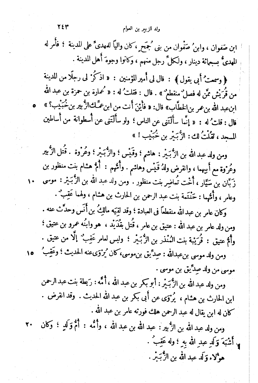 وسمعت أبي يقول: قال لي أمير المؤمنين: " اذكر لي رجلاً من المدينة من قريش ممن قريش ممن له فصل منقطع ". قال: " فقلت له: " عمارة بن حمزة بن عبد الله بن عبد الله بن عمر بن الخطاب " قال: " فأين أنت من ابن عمك الزبير بن خبيب؟ " قال: قلت له: " إنما سألتني عن الناس؛ ولو سألتني عن أسطوانة من أساطين المسجد، لقلت لك: الزبير بن خبيب! " ومن ولد عبد الله بن الزبير: هاشم؛ وقيس؛ والزبير؛ وعروة. قتل الزبير وعروة مع أبيهما، وانقرض ولد قيس وهاشم. وأمهم: أم هشام بنت منظور بن زبان بن سيار، أخت تماضر بنت منظور. ومن ولد عبد الله بن الزبير: موسى وعامر، وأمهما: حنتمة بنت عبد الرحمن بن الحارث بن هشام، ولهما عقب.