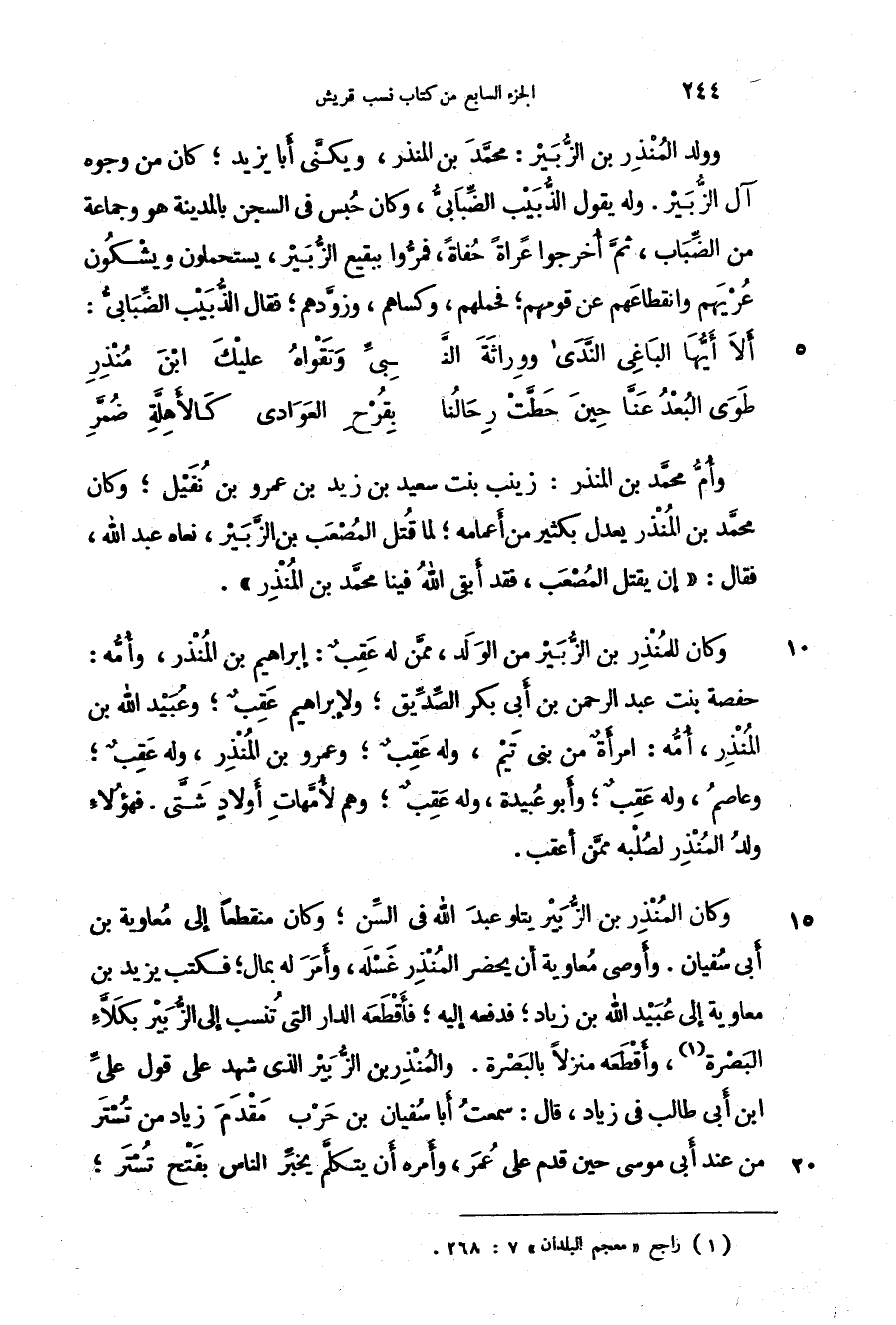 وولد المنذر بن الزبير: محمد بن المنذر، ويكنى أبا يزيد؛ كان من وجوه آل الزبير. وله يقول الذبيب الضبابي، وكان حبس في السجن بالمدينة هو وجماعة من الضباب، ثم أخرجوا عراة حفاة، فمروا ببقيع الزبير، يستحملون ويشكون عريهم وانقطاعهم عن قومهم؛ فحملهم، وكساهم، وزودهم؛ فقال الذبيب الضبابي: