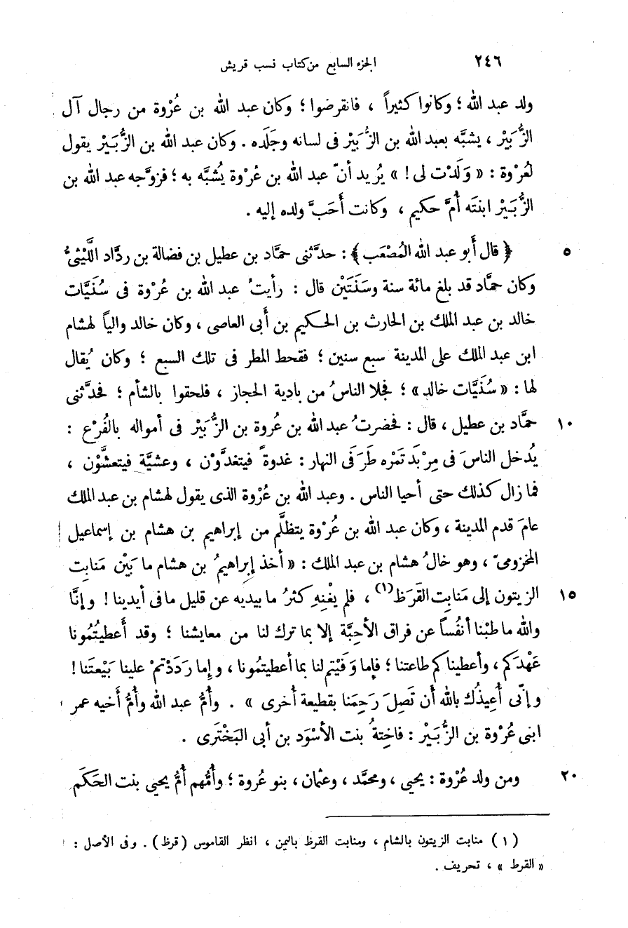 قال أبو عبد الله المصعب: حدثني حماد بن عطيل بن فضالة بن رداد الليثي وكان حماد قد بلغ مائة سنة وستين قال: رأيت عبد الله بن عروة في سنيات خالد بن عبد الملك بن الحارث بن الحكيم بن أبي العاصي، وكان خالد والياً لهشام بن عبد الملك على المدينة سبع سنين؛ فقحط المطر في تلك السبع؛ وكان يقال لها: " سنيات خالد "؛ فجلا الناس من بادية الحجاز، فلحقوا بالشأم؛ فحدثني حماد بن عطيل، قال: فحضرت عبد الله بن عروة بن الزبير في أمواله بالفرع: يدخل الناس في مربد تمره طرفي النهار: غدوة فيتغدون، وعشية فيتعشون، فما زال كذلك حتى أحيا الناس. وعبد الله بن عروة الذي يقول لهشام بن عبد الملك عام قدم المدينة، وكان عبد الله بن عروة يتظلم من إبراهيم بن هشام بن إسماعيل المخزومي، وهو خال هشام بن عبد الملك: " أخذ إبراهيم بن هشام ما بين منابت الزيتون إلى منابت القرظ، فلم يغنه كثر ما بيده عن قليل ما في أيدينا! وإنا والله ما طبنا أنفساً عن فراق الأحبة إلا بما ترك من معايشنا؛ وقد أعطيتمونا عهدكم، وأعطيناكم طاعتنا؛ فإما وفيتم لنا بما أعطيتمونا، وإما رددتم علينا بيعتنا! وإني أعيذ بالله أن تصل رحمنا بقطيعة أخرى ". وأم عبد الله وأم أخيه عمر أبني عروة بن الزبير: فاختة بنت الأسود بن أبي البختري.
