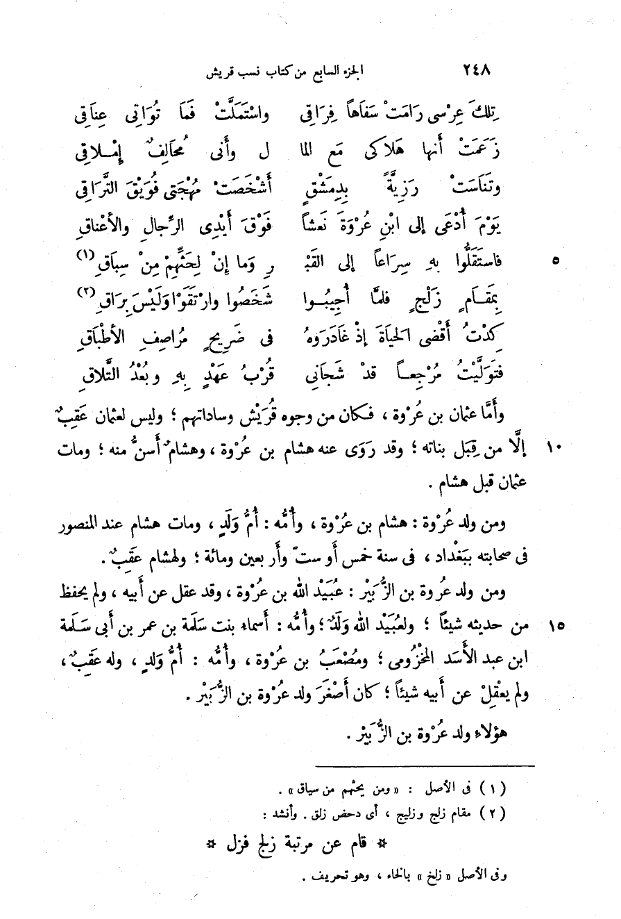 ومن ولد عروة: هشام بن عروة، وأمه: أم ولد، ومات هشام عند المنصور في صحابته ببغداد، في سنة خمس أو ست وأربعين ومائة؛ ولهشام عقب.