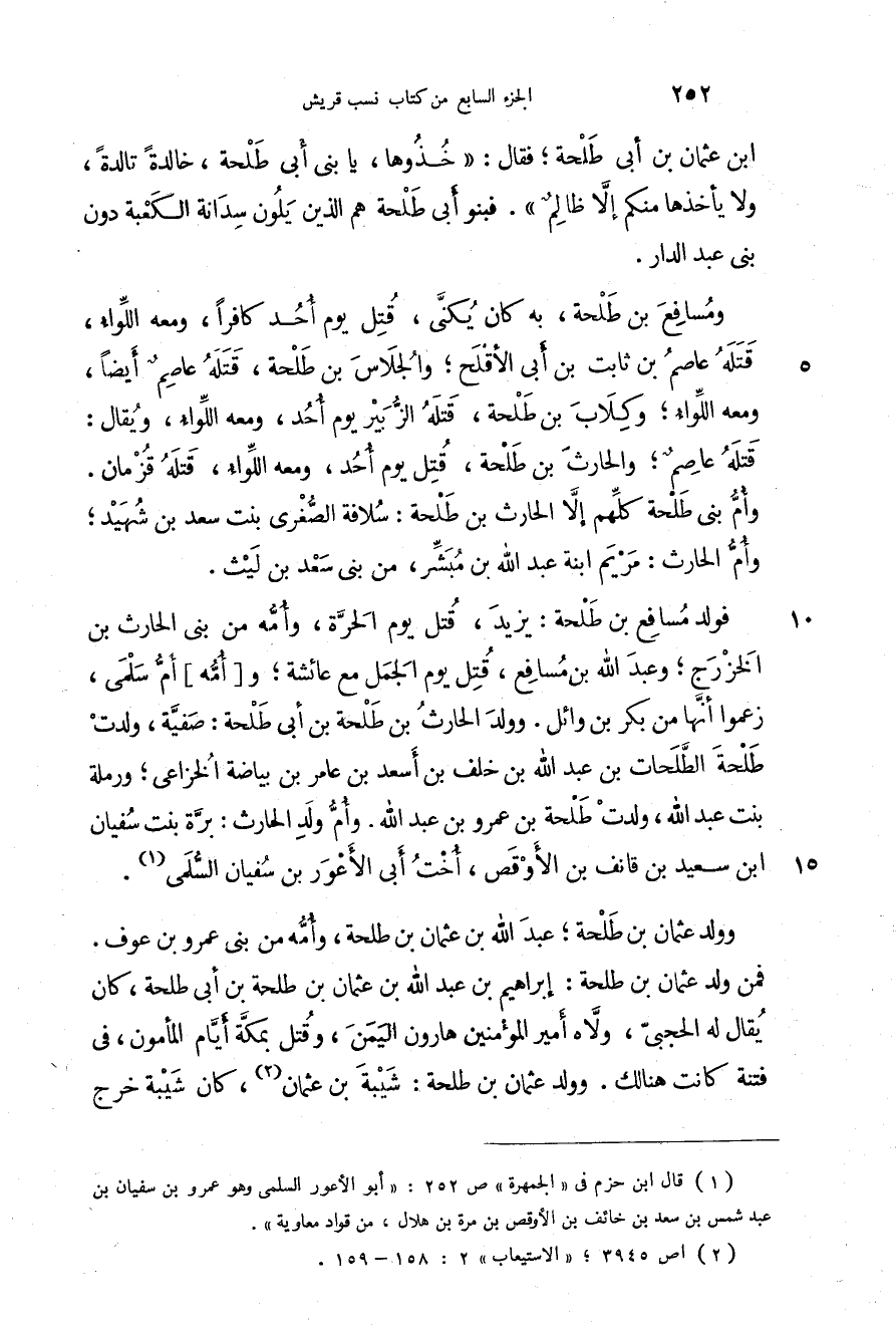 ومسافع بن طلحة، به كان يكنى، قتل يوم أحد كافراً، ومعه اللواء، قتله عاصم بن ثابت بن أبي الأقلح؛ والجلاس بن طلحة، قتله عاصم أيضاً، ومعه اللواء؛ وكلاب بن طلحة، قتله الزبير يوم أحد، ومعه اللواء، ويقال: قتله عاصم؛ الحارث بن طلحة، قتل يوم أحد، ومعه اللواء، قتله قزمان. وأم بني طلحة كلهم إلا الحارث بن طلحة: سلافة الصغرى بنت سعد بن شهيد؛ وأم الحارث: مريم ابنة عبد الله بن مبشر، من بني سعد بن ليث.
