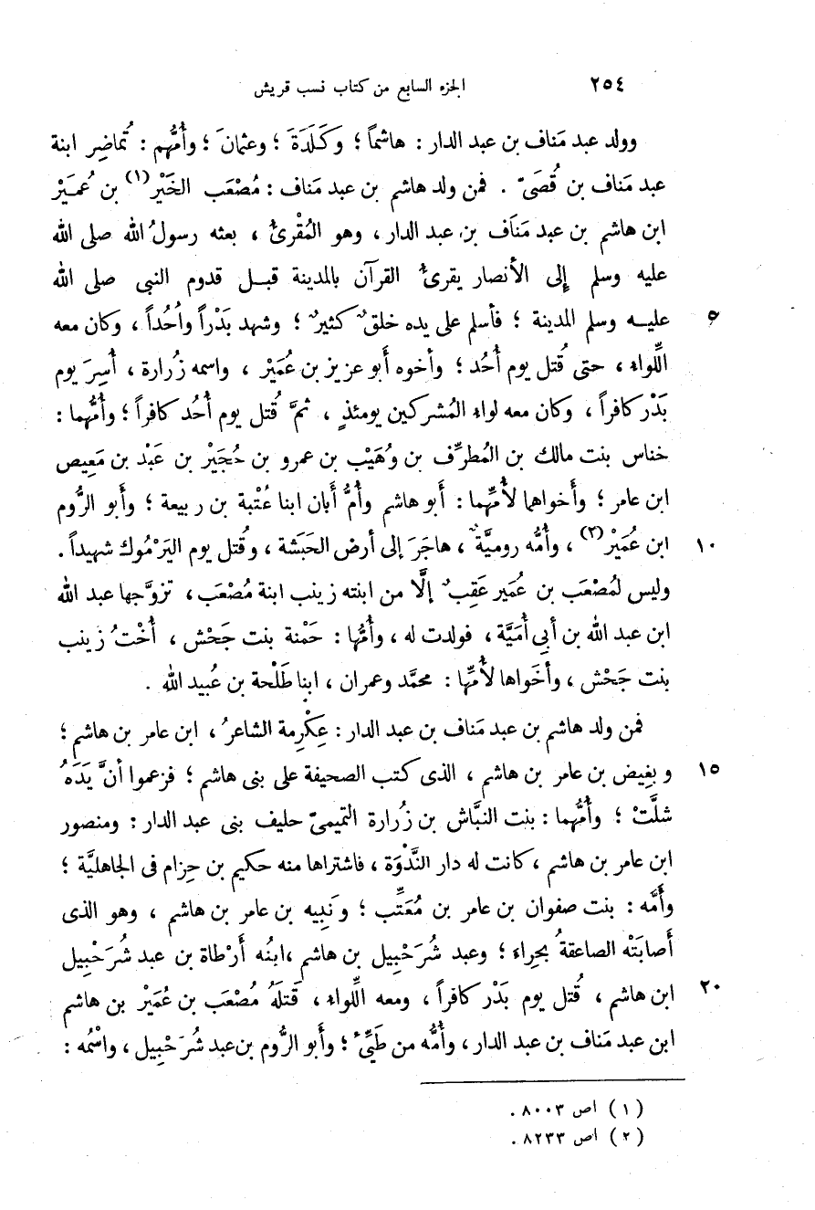 وولد عبد مناف بن عبد الدار: هاشماً؛ وكلدة؛ وعثمان؛ وأمهم: تماضر ابنة عبد مناف بن قصي. فمن ولد هاشم بن عبد مناف: مصعب الخير بن عمير بن هاشم بن عبد مناف بن عبد الدار، وهو المقرئ، بعثه رسول الله صَلَّى اللهُ عَلَيْهِ وَسَلَّمَ إلى الأنصار يقرئ القرآن بالمدينة قبل قدوم النبي صَلَّى اللهُ عَلَيْهِ وَسَلَّمَ المدينة؛ فأسلم على يده خلق كثير؛ وشهد بدراً واحداً، وكان معه اللواء، حتى قتل يوم أحد؛ وأخوه أبو عزيز بن عمير، واسمه زرارة، أسر يوم بدر كافراً، وكان معه لواء المشركين يومئذ، ثم قتل يوم أحد كافراً؛ وأمهما: خناس بنت مالك بن المطرف بن وهيب بن عمرو بن حجير بن عبد بن معيص بن عامر؛ وأخواهما لأمهما: أبو هاشم وأم أبان ابنا عتبة بن ربيعة؛ وأبو الروم بن عمير، وأمه رومية، هاجر إلى أرض الحبشة، وقتل يوم اليرموك شهيداً. وليس لمصعب بن عمير عقب إلا من ابنته زينب ابنة المصعب، تزوجها عبد الله بن عبد الله بن أبي أمية، فولدت له، وأمها: حمنة بنت جحش، أخت زينب بنت جحش، وأخواهما لأمها: محمد وعمران، ابنا طلحة بن عبيد الله.
